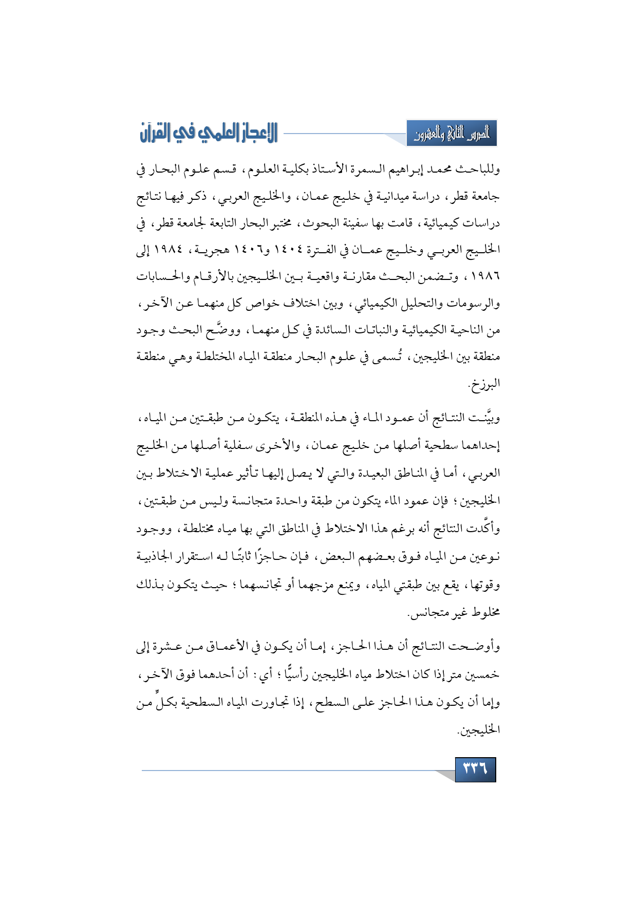 وللباحث محمد إبراهيم السمرة الأستاذ بكلية العلوم، قسم علوم البحار في جامعة قطر، دراسة ميدانية في خليج عمان، والخليج العربي، ذكر فيها نتائج دراسات كيميائية، قامت بها سفينة البحوث، مختبر البحار التابعة لجامعة قطر، في الخليج العربي وخليج عمان في الفترة 1404 و1406 هجرية، 1984 إلى 1986، وتضمن البحث مقارنة واقعية بين الخليجين بالأرقام والحسابات والرسومات والتحليل الكيميائي، وبين اختلاف خواص كل منهما عن الآخر، من الناحية الكيميائية والنباتات السائدة في كل منهما، ووضَّح البحث وجود منطقة بين الخليجين، تُسمى في علوم البحار منطقة المياه المختلطة وهي منطقة البرزخ.