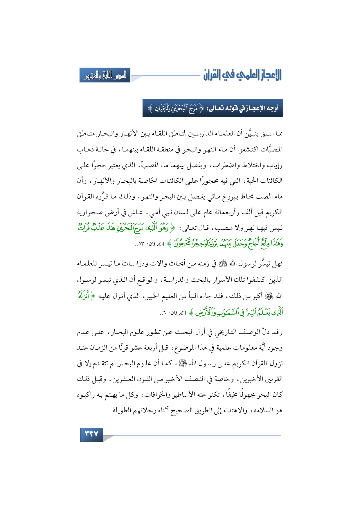 وقد دلَّ الوصف التاريخي في أول البحث عن تطور علوم البحار، على عدم وجود أيَّة معلومات علمية في هذا الموضوع، قبل أربعة عشر قرنًا من الزمان عند نزول القرآن الكريم على رسول الله -صلى الله عليه وسلم، كما أن علوم البحار لم تتقدم إلا في القرنين الأخيرين، وخاصة في النصف الأخير من القرن العشرين، وقبل ذلك كان البحر مجهولًا مخيفًا، تكثر عنه الأساطير والخرافات، وكل ما يهتم به راكبوه هو السلامة، والاهتداء إلى الطريق الصحيح أثناء رحلاتهم الطويلة.