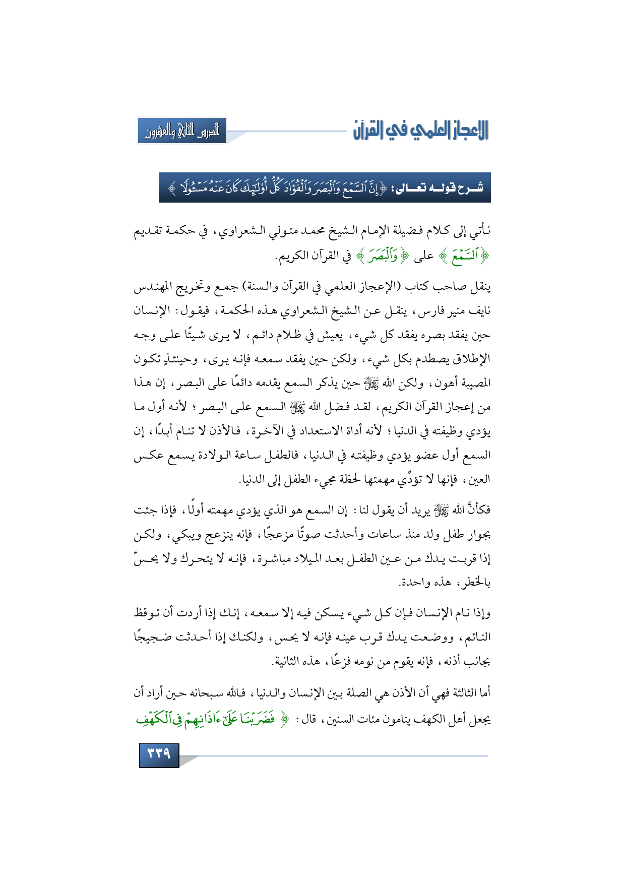 ينقل صاحب كتاب (الإعجاز العلمي في القرآن والسنة) جمع وتخريج المهندس نايف منير فارس، ينقل عن الشيخ الشعراوي هذه الحكمة، فيقول: الإنسان حين يفقد بصره يفقد كل شيء، يعيش في ظلام دائم، لا يرى شيئًا على وجه الإطلاق يصطدم بكل شيء، ولكن حين يفقد سمعه فإنه يرى، وحينئذٍ تكون المصيبة أهون، ولكن الله -سبحانه وتعالى- حين يذكر السمع يقدمه دائمًا على البصر، إن هذا من إعجاز القرآن الكريم، لقد فضل الله -سبحانه وتعالى- السمع على البصر؛ لأنه أول ما يؤدي وظيفته في الدنيا؛ لأنه أداة الاستعداد في الآخرة، فالأذن لا تنام أبدًا، إن السمع أول عضو يؤدي وظيفته في الدنيا، فالطفل ساعة الولادة يسمع عكس العين، فإنها لا تؤدِّي مهمتها لحظة مجيء الطفل إلى الدنيا.