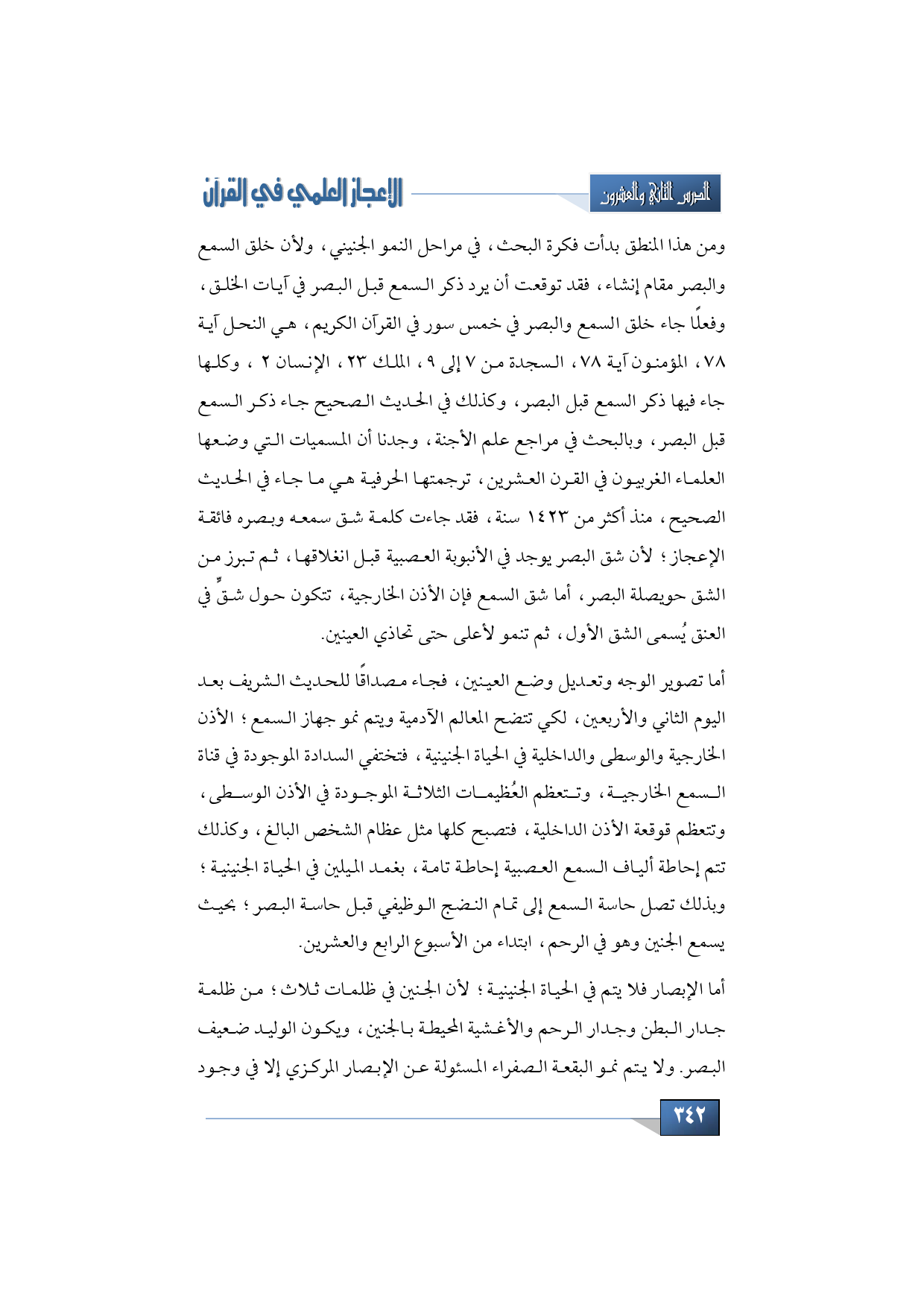 ومن هذا المنطق بدأت فكرة البحث، في مراحل النمو الجنيني، ولأن خلق السمع والبصر مقام إنشاء، فقد توقعت أن يرد ذكر السمع قبل البصر في آيات الخلق، وفعلًا جاء خلق السمع والبصر في خمس سور في القرآن الكريم، هي النحل آية 78، المؤمنون آية 78، السجدة من 7 إلى 9، الملك 23، الإنسان 2، وكلها جاء فيها ذكر السمع قبل البصر، وكذلك في الحديث الصحيح جاء ذكر السمع قبل البصر، وبالبحث في مراجع علم الأجنة، وجدنا أن المسميات التي وضعها العلماء الغربيون في القرن العشرين، ترجمتها الحرفية هي ما جاء في الحديث الصحيح، منذ أكثر من 1423 سنة، فقد جاءت كلمة شق سمعه وبصره فائقة الإعجاز؛ لأن شق البصر يوجد في الأنبوبة العصبية قبل انغلاقها، ثم تبرز من الشق حويصلة البصر، أما شق السمع فإن الأذن الخارجية، تتكون حول شقٍّ في العنق يُسمى الشق الأول، ثم تنمو لأعلى حتى تحاذي العينين.