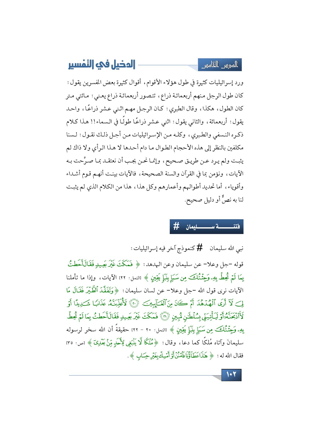 قوله - جل وعلا - عن سليمان وعن الهدهد: {فَمَكَثَ غَيْرَ بَعِيدٍ فَقَالَ أَحَطتُ بِمَا لَمْ تُحِطْ بِهِ وَجِئْتُكَ مِنْ سَبَإٍ بِنَبَإٍ يَقِينٍ} (النمل: 22) الآيات، وإذا ما تأملنا الآيات نرى قول الله - جل وعلا - عن لسان سليمان: {وَتَفَقَّدَ الطَّيْرَ فَقَالَ مَا لِيَ لَا أَرَى الْهُدْهُدَ أَمْ كَانَ مِنَ الْغَائِبِينَ * لَأُعَذِّبَنَّهُ عَذَابًا شَدِيدًا أَوْ لَأَذْبَحَنَّهُ أَوْ لَيَأْتِيَنِّي بِسُلْطَانٍ مُبِينٍ * فَمَكَثَ غَيْرَ بَعِيدٍ فَقَالَ أَحَطتُ بِمَا لَمْ تُحِطْ بِهِ وَجِئْتُكَ مِنْ سَبَإٍ بِنَبَإٍ يَقِينٍ} (النمل: 20 - 22) حقيقةً أن الله سخر لرسوله سليمانَ وآ تاه مُلكًا كما دعا، وقال: {مُلْكًا لَا يَنْبَغِي لِأَحَدٍ مِنْ بَعْدِي} (ص: 35) فقال الله له: {هَذَا عَطَاؤُنَا فَامْنُنْ أَوْ أَمْسِكْ بِغَيْرِ حِسَابٍ}.