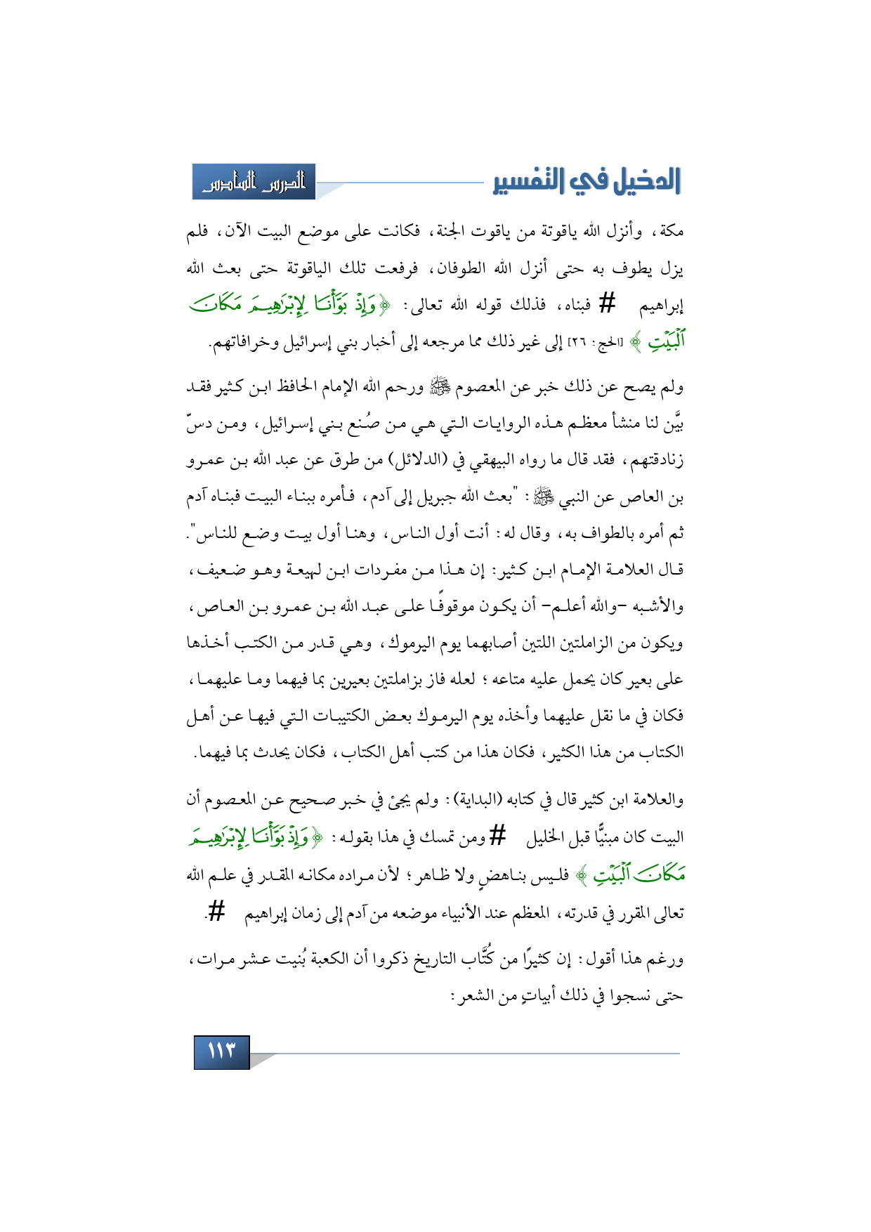 والعلامة ابن كثير قال في كتابه (البداية): ولم يجئ في خبر صحيح عن المعصوم أن البيت كان مبنيًّا قبل الخليل -عليه السلام - ومن تمسك في هذا بقوله: {وَإِذْ بَوَّأْنَا لِإِبْرَاهِيمَ مَكَانَ الْبَيْتِ} فليس بناهضٍ ولا ظاهر؛ لأن مراده مكانه المقدر في علم الله تعالى المقرر في قدرته، المعظم عند الأنبياء موضعه من آدم إلى زمان إبراهيم -عليه السلام.