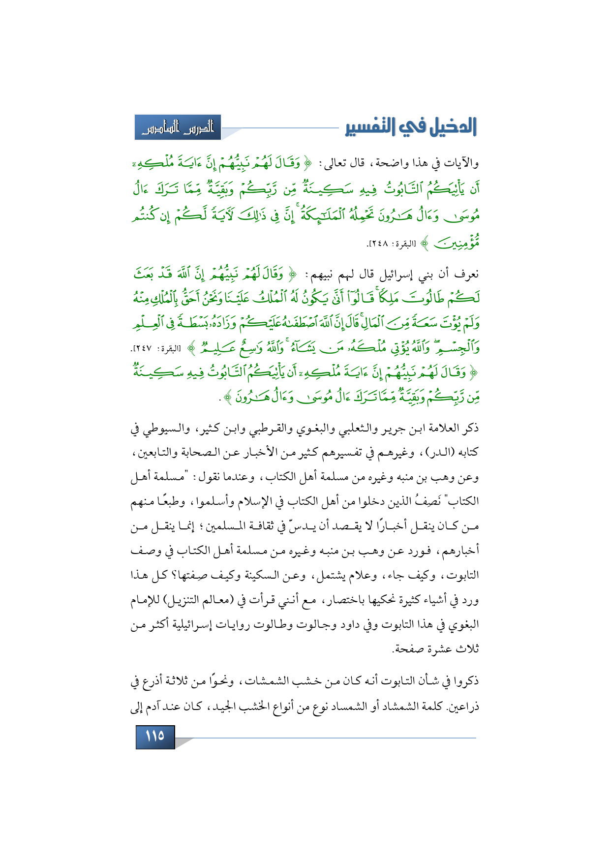ذكر العلامة ابن جرير والثعلبي والبغوي والقرطبي وابن كثير، والسيوطي في كتابه (الدر)، وغيرهم في تفسيرهم كثير من الأخبار عن الصحابة والتابعين، وعن وهب بن منبه وغيره من مسلمة أهل الكتاب، وعندما نقول: "مسلمة أهل الكتاب" نَصِفُ الذين دخلوا من أهل الكتاب في الإسلام وأسلموا، وطبعًا منهم من كان ينقل أخبارًا لا يقصد أن يدسّ في ثقافة المسلمين؛ إنما ينقل من أخبارهم، فورد عن وهب بن منبه وغيره من مسلمة أهل الكتاب في وصف التابوت، وكيف جاء، وعلام يشتمل، وعن السكينة وكيف صِفتها؟ كل هذا ورد في أشياء كثيرة نحكيها باختصار، مع أنني قرأت في (معالم التنزيل) للإمام البغوي في هذا التابوت وفي داود وجالوت وطالوت روايات إسرائيلية أكثر من ثلاث عشرة صفحة.