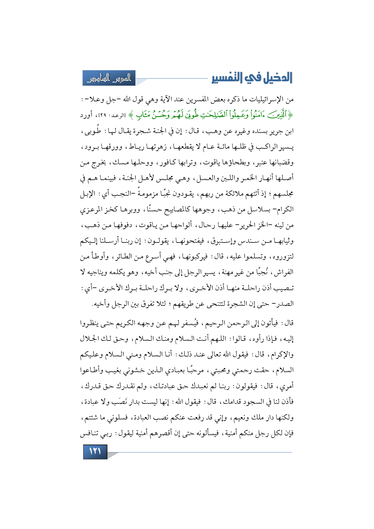 من الإسرائيليات ما ذكره بعض المفسرين عند الآية وهي قول الله -جل وعلا-: {الَّذِينَ آمَنُوا وَعَمِلُوا الصَّالِحَاتِ طُوبَى لَهُمْ وَحُسْنُ مَآبٍ} (الرعد: 29)، أورد ابن جرير بسنده وغيره عن وهب، قال: إن في الجنة شجرة يقال لها: طُوبى، يسير الراكب في ظلها مائة عام لا يقطعها، زهرتها رياط، وورقها برود، وقضبانها عنبر، وبطحاؤها ياقوت، وترابها كافور، ووحلها مسك، يخرج من أصلها أنهار الخمر واللبن والعسل، وهي مجلس لأهل الجنة، فبينما هم في مجلسهم؛ إذ أتتهم ملائكة من ربهم، يقودون نجبًا مزمومةً -النجب أي: الإبل الكرام- بسلاسل من ذهب، وجوهها كالمصابيح حسنًا، ووبرها كخز المرعزي من لينه -الخز الحرير- عليها رحال، ألواحها من ياقوت، دفوفها من ذهب، وثيابها من سندس وإستبرق، فيفتحونها، يقولون: إن ربنا أرسلنا إليكم لتزوروه، وتسلموا عليه، قال: فيركبونها، فهي أسرع من الطائر، وأوطأ من الفراش، نُجبًا من غير مهنة، يسير الرجل إلى جنب أخيه، وهو يكلمه ويناجيه لا تصيب أذن راحلة منها أذن الأخرى، ولا برك راحلة برك الأخرى -أي: الصدر- حتى إن الشجرة لتتنحى عن طريقهم؛ لئلا تفرق بين الرجل وأخيه.