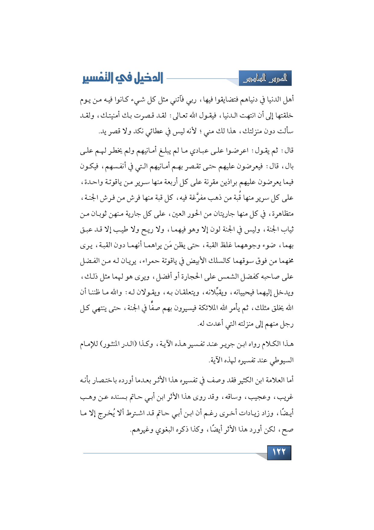 قال: ثم يقول: اعرضوا على عبادي ما لم يبلغ أمانيهم ولم يخطر لهم على بال، قال: فيعرضون عليهم حتى تقصر بهم أمانيهم التي في أنفسهم، فيكون فيما يعرضون عليهم براذين مقرنة على كل أربعة منها سرير من ياقوتة واحدة، على كل سرير منها قُبة من ذهب مفرَّغة فيه، كل قبة منها فرش من فرش الجنة، متظاهرة، في كل منها جاريتان من الحور العين، على كل جارية منهن ثوبان من ثياب الجنة، وليس في الجنة لون إلا وهو فيهما، ولا ريح ولا طيب إلا قد عبق بهما، ضوء وجوههما غلظ القبة، حتى يظن مَن يراهما أنهما دون القبة، يرى مخهما من فوق سوقهما كالسلك الأبيض في ياقوتة حمراء، يريان له من الفضل على صاحبه كفضل الشمس على الحجارة أو أفضل، ويرى هو لهما مثل ذلك، ويدخل إليهما فيحييانه، ويقبِّلانه، ويتعلقان به، ويقولان له: والله ما ظننا أن الله يخلق مثلك، ثم يأمر الله الملائكة فيسيرون بهم صفًّا في الجنة، حتى ينتهي كل رجل منهم إلى منزلته التي أعدت له.