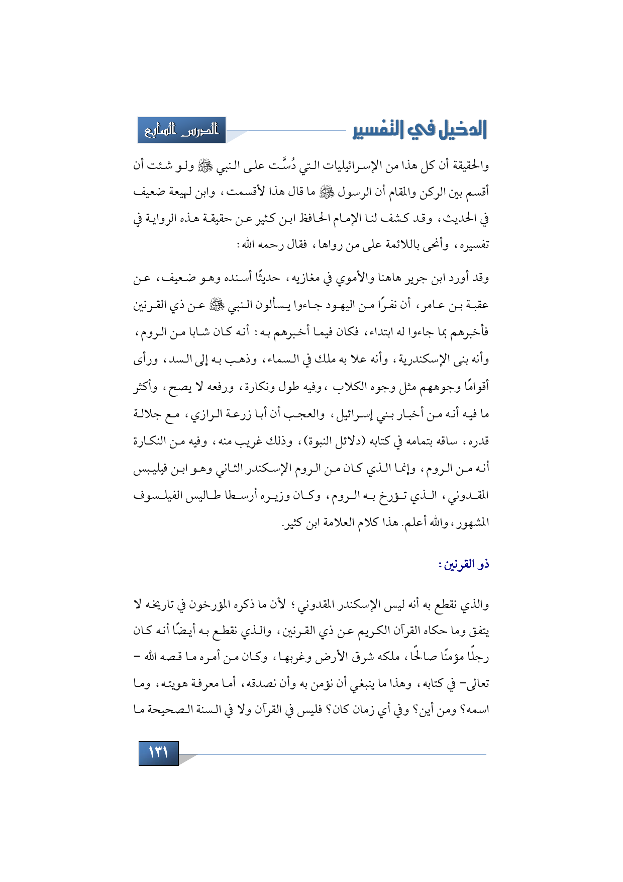 وقد أورد ابن جرير هـ اهنا والأموي في مغازيه، حديثًا أسنده وهو ضعيف، عن عقبة بن عامر، أن نفرًا من اليهود جاءوا يسألون النبي -صلى الله عليه وسلم- عن ذي القرنين فأخبرهم بما جاءوا له ابتداء، فكان فيما أخبرهم به: أنه كان شابا من الروم، وأنه بنى الإسكندرية، وأنه علا به ملك في السماء، وذهب به إلى السد، ورأى أقوامًا وجوههم مثل وجوه الكلاب، وفيه طول ونكارة، ورفعه لا يصح، وأكثر ما فيه أنه من أخبار بني إسرائيل، والعجب أن أبا زرعة الرازي، مع جلالة قدره، ساقه بتمامه في كتابه (دلائل النبوة)، وذلك غريب منه، وفيه من النكارة أنه من الروم، وإنما الذي كان من الروم الإسكندر الثاني وهو ابن فيليبس المقدوني، الذي تؤرخ به الروم، وكان وزيره أرسطا طاليس الفيلسوف المشهور، والله أعلم. هذا كلام العلامة ابن كثير.