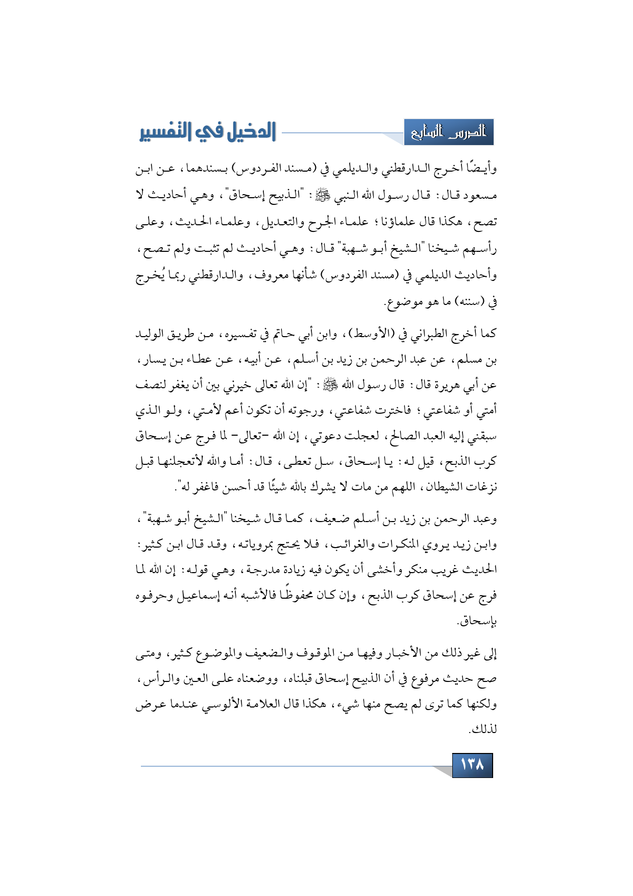 وأيضًا أخرج الدارقطني والديلمي في (مسند الفردوس) بسندهما، عن ابن مسعود قال: قال رسول الله النبي -صلى الله عليه وسلم-: "الذبيح إسحاق"، وهي أحاديث لا تصح، هكذا قال علماؤنا؛ علماء الجرح والتعديل، وعلماء الحديث، وعلى رأسهم شيخنا "الشيخ أبو شهبة" قال: وهي أحاديث لم تثبت ولم تصح، وأحاديث الديلمي في (مسند الفردوس) شأنها معروف، والدارقطني ربما يُخرج في (سننه) ما هو موضوع.