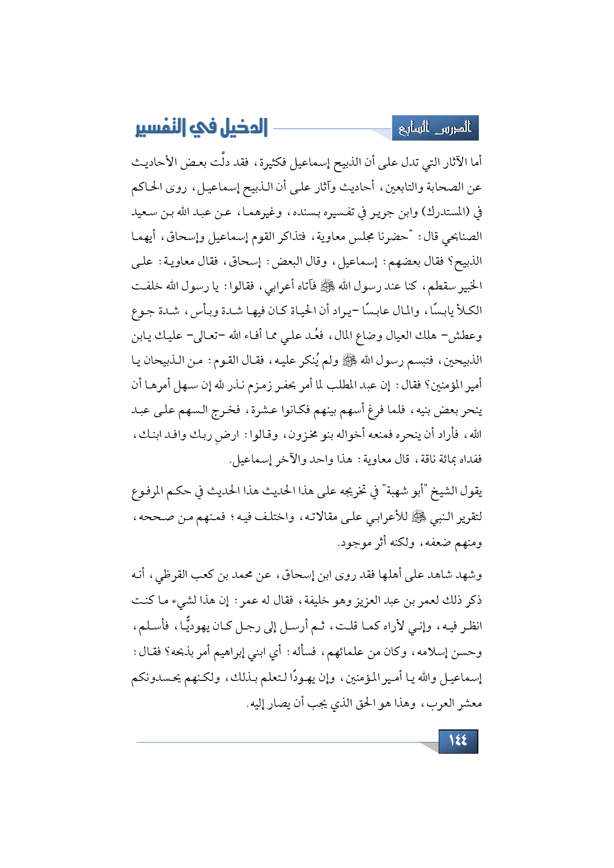 أما الآثار التي تدل على أن الذبيح إسماعيل فكثيرة، فقد دلَّت بعض الأحاديث عن الصحابة والتابعين، أحاديث وآثار على أن الذبيح إسماعيل، روى الحاكم في (المستدرك) وابن جرير في تفسيره بسنده، وغيرهما، عن عبد الله بن سعيد الصنابحي قال: "حضرنا مجلس معاوية، فتذاكر القوم إسماعيل وإسحاق، أيهما الذبيح؟ فقال بعضهم: إسماعيل، وقال البعض: إسحاق، فقال معاوية: على الخبير سقطم، كنا عند رسول الله -صلى الله عليه وسلم- فآتاه أعرابي، فقالوا: يا رسول الله خلفت الكلأ يابسًا، والمال عابسًا -يراد أن الحياة كان فيها شدة وبأس، شدة جوع وعطش- هلك ال عيال وضاع المال، فعُد علي مما أفاء الله -تعالى- عليك يابن الذبيحين، فتبسم رسول الله -صلى الله عليه وسلم- ولم يُنكر عليه، فقال القوم: من الذبيحان يا أمير المؤمنين؟ فقال: إن عبد المطلب لما أمر بحفر زمزم نذر لله إن سهل أمرها أن ينحر بعض بنيه، فلما فرغ أسهم بينهم فكانوا عشرة، فخرج السهم على عبد الله، فأراد أن ينحره فمنعه أخواله بنو مخزون، وقالوا: ارضِ ربك وافد ابنك، ففداه بمائة ناقة، قال معاوية: هذا واحد والآخر إسماعيل.
