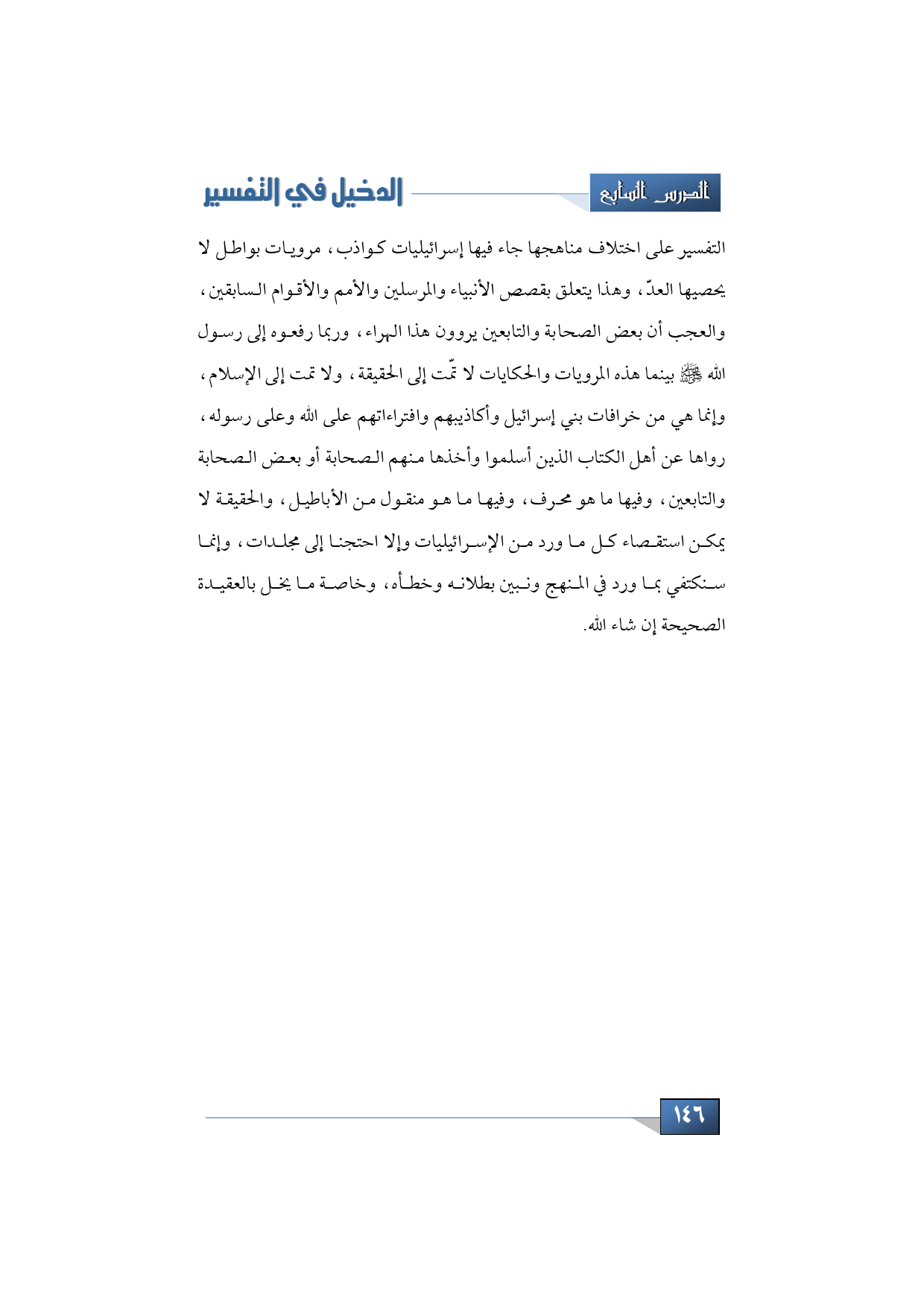 التفسير على اختلاف مناهجها جاء فيها إسرائيليات كواذب، مرويات بواطل لا يحصيها العدّ، وهذا يتعلق بقصص الأنبياء والمرسلين والأمم والأقوام السابقين، والعجب أن بعض الصحابة والتابعين يروون هذا الهراء، وربما رفعوه إلى رسول الله -صلى الله عليه وسلم- بينما هذه المرويات والحكايات لا تمّت إلى الحقيقة، ولا تمت إلى الإسلام، وإنما هي من خرافات بني إسرائيل وأكاذيبهم وافتراءاتهم على الله وعلى رسوله، رواها عن أهل الكتاب الذين أسلموا وأخذها منهم الصحابة أو بعض الصحابة والتابعين، وفيها ما هو محرف، وفيها ما هو منقول من الأباطيل، والحقيقة لا يمكن استقصاء كل ما ورد من الإسرائيليات وإلا احتجنا إلى مجلدات، وإنما سنكتفي بما ورد في المنهج ونبين بطلانه وخطأه، وخاصة ما يخل بالعقيدة الصحيحة إن شاء الله.