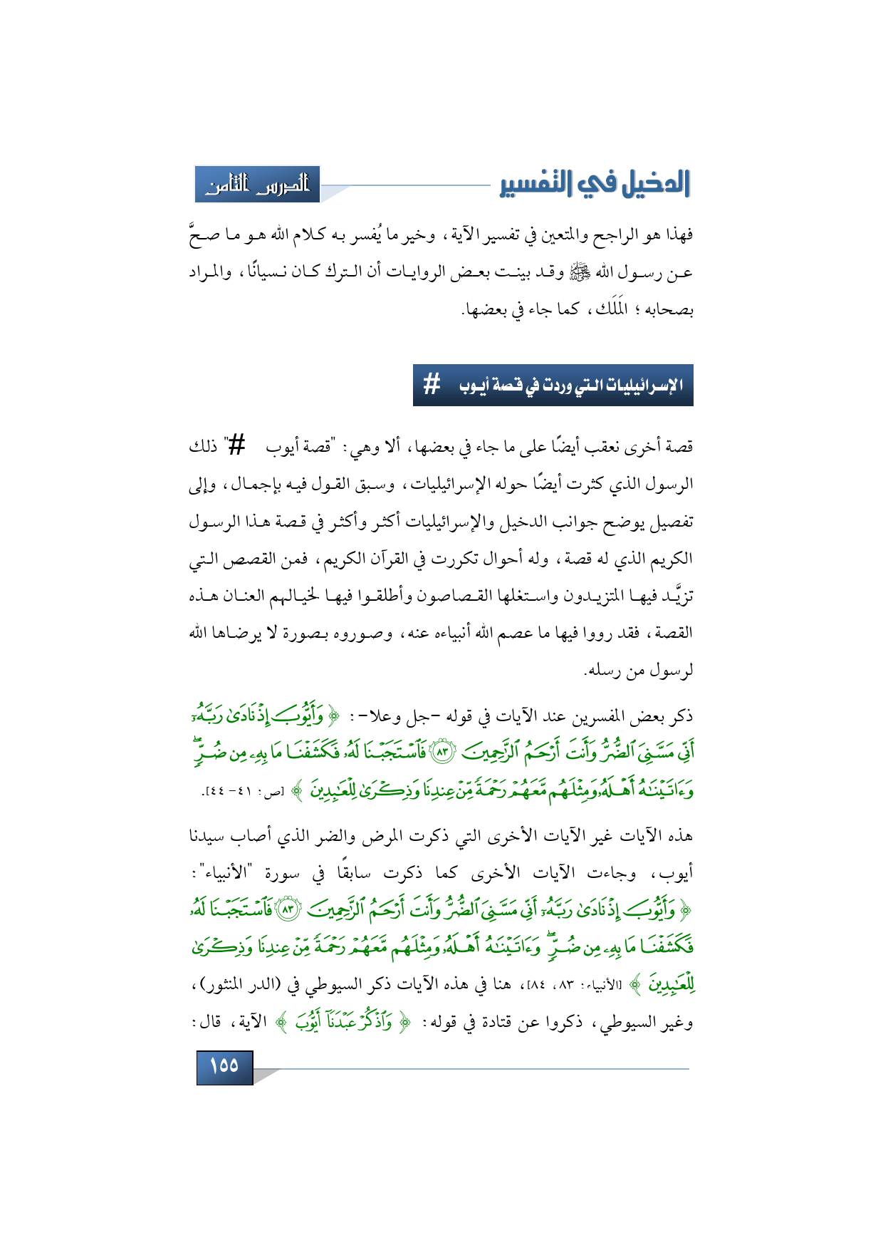 قصة أخرى نعقب أيضًا على ما جاء في بعضها، ألا وهي: "قصة أيوب - عليه السلام - " ذلك الرسول الذي كثرت أيضًا حوله الإسرائيليات، وسبق القول فيه بإجمال، وإلى تفصيل يوضح جوانب الدخيل والإسرائيليات أكثر وأكثر في قصة هذا الرسول الكريم الذي له قصة، وله أحوال تكررت في القرآن الكريم، فمن القصص التي تزيَّد فيها المتزيدون واستغلها القصاصون وأطلقوا فيها لخيالهم العنان هذه القصة، فقد رووا فيها ما عصم الله أنبياءه عنه، وصور وهـ بصورة لا يرضاها الله لرسول من رسله.