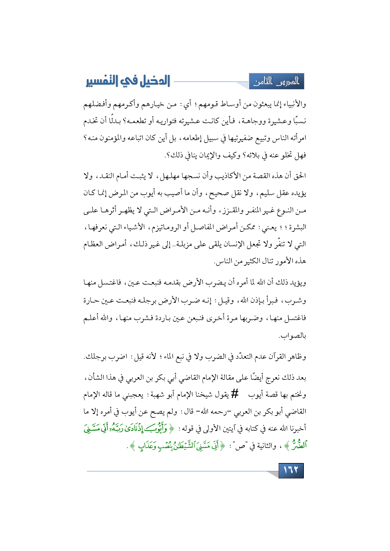 بعد ذلك نعرج أيضًا على مقالة الإمام القاضي أب ي بكر بن العربي في هذا الشأن، ونختم بها قصة أيوب -عليه السلام- يقول شيخنا الإمام أبو شهبة: يعجبني ما قاله الإمام القاضي أبو بكر بن العربي -رحمه الله- قال: ولم يصح عن أيوب في أمره إلا ما أخبرنا الله عنه في كتابه في آيتين الأولى في قوله: {وَأَيُّوبَ إِذْ نَادَى رَبَّهُ أَنِّي مَسَّنِيَ الضُّرُّ}، والثانية في "ص": {أَنِّي مَسَّنِيَ الشَّيْطَانُ بِنُصْبٍ وَعَذَابٍ}.