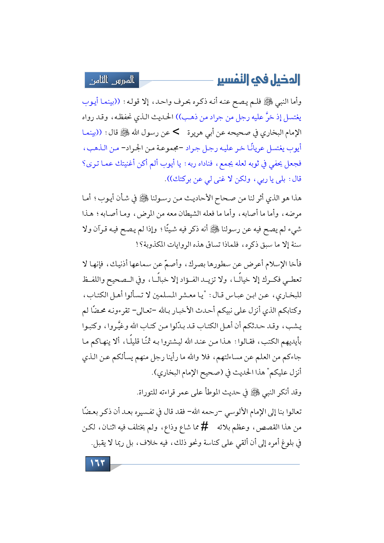فأخا الإسلام أعرض عن سطورها بصرك، وأصمّ عن سم اعها أذنيك، فإنها لا تعطي فكرك إلا خيالًا، ولا تزيد الفؤاد إلا خبال ًا، وفي الصحيح واللفظ للبخاري، عن ابن عباس قال: "يا معشر المسلمين لا تسألوا أهل الكتاب، وكتابكم الذي أنزل على نبيكم أحدث الأخبار بالله - تعالى - تقرءونه محضًا لم يشب، وقد حدثكم أن أهل الكتاب قد بدّلوا من كتاب الله وغيَّروا، وكتبوا بأيديهم الكتب، فقالوا: هذا من عند الله ليشتروا به ثمنًا قليلًا، ألا ينهاكم ما جاءكم من العلم عن مساءلتهم، ف لا والله ما رأينا رجل منهم يسألكم عن الذي أنزل عليكم" هذا الحديث في (صحيح الإمام البخاري).