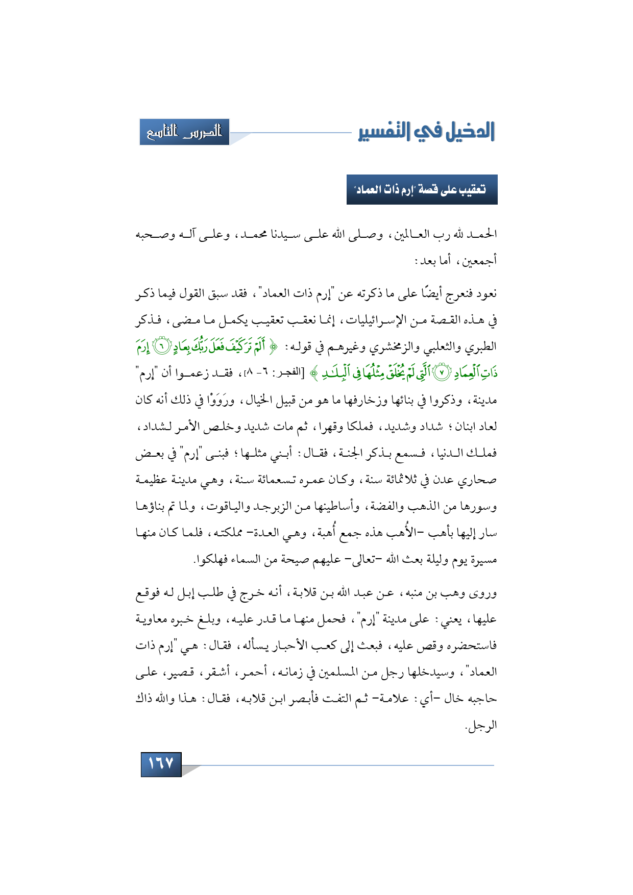 نعود فنعرج أيضًا على ما ذكرته عن "إرم ذات العماد"، فقد سبق القول فيما ذكر في هذه القصة من الإسرائيليات، إنما نعقب تعقيب يكمل ما مضى، فذكر الطبري والثعلبي والزمخشري وغيرهم في قوله: {أَلَمْ تَرَ كَيْفَ فَعَلَ رَبُّكَ بِعَادٍ * إِرَمَ ذَاتِ الْعِمَادِ * الَّتِي لَمْ يُخْلَقْ مِثْلُهَا فِي الْبِلَاد} (الفجر: 6 - 8)، فقد زعموا أن " إرم " مدينة، وذكروا في بنائها وزخارفها ما هو من قبيل الخيال، ورَوَوْا في ذلك أنه كان لعاد ابنان؛ شداد وشديد، فملكا وقهرا، ثم مات شديد وخلص الأمر لشداد، فملك الدنيا، فسمع بذكر الجنة، فقال: أبني مثلها؛ فبنى " إرم " في بعض صحاري عدن في ثلاثمائة سنة، وكان عمره تسعمائة سنة، وهي مدينة عظيمة وسورها من الذهب والفضة، وأساطينها من الزبرجد والي اقوت، ولما تم بناؤها س ار إليها بأ هـ ب -الأُ هـ ب هذه جمع أُ هـ بة، وهي العدة- مملكته، فلما كان منها مسيرة يوم وليلة بعث الله - تعالى - عليهم صيحة من السماء فهلكوا.