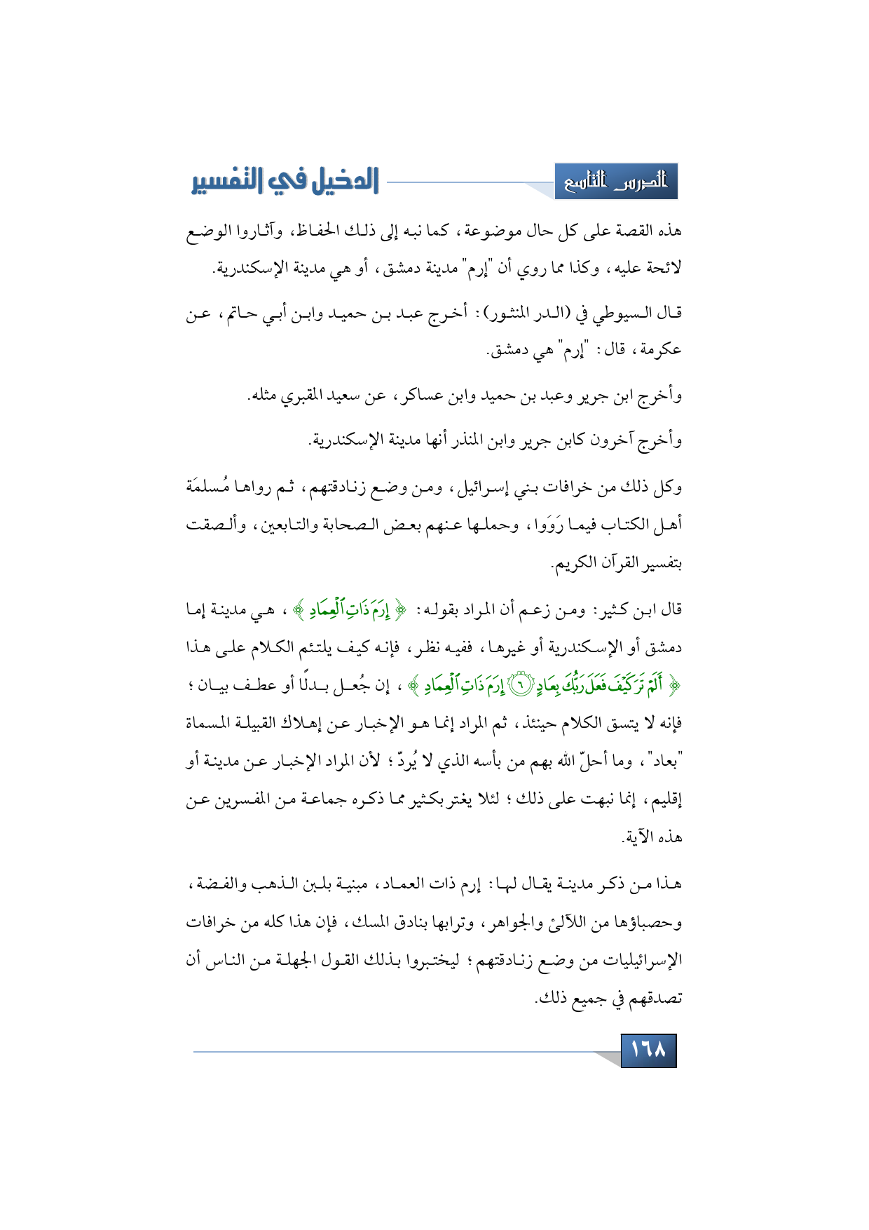 قال ابن كثير: ومن زعم أن المراد بقوله: {إِرَمَ ذَاتِ الْعِمَادِ}، هي مدينة إما دمشق أو الإسكندرية أو غيرها، ففيه نظر، فإنه كيف يلتئم الكلام على هذا {أَلَمْ تَرَ كَيْفَ فَعَلَ رَبُّكَ بِعَادٍ * إِرَمَ ذَاتِ الْعِمَادِ}، إن جُعل بدلًا أو عطف بيان؛ فإنه لا يتسق الكلام حينئذ، ثم المراد إنما هو الإخبار عن إهلاك القبيلة المسماة "بعاد"، وما أحلّ الله بهم من بأسه الذي لا يُردّ؛ لأن المراد الإخبار عن مدينة أو إقليم، إنما نبهت على ذلك؛ لئلا يغتر بكثير مما ذكره جماعة من المفسرين عن هذه الآية.