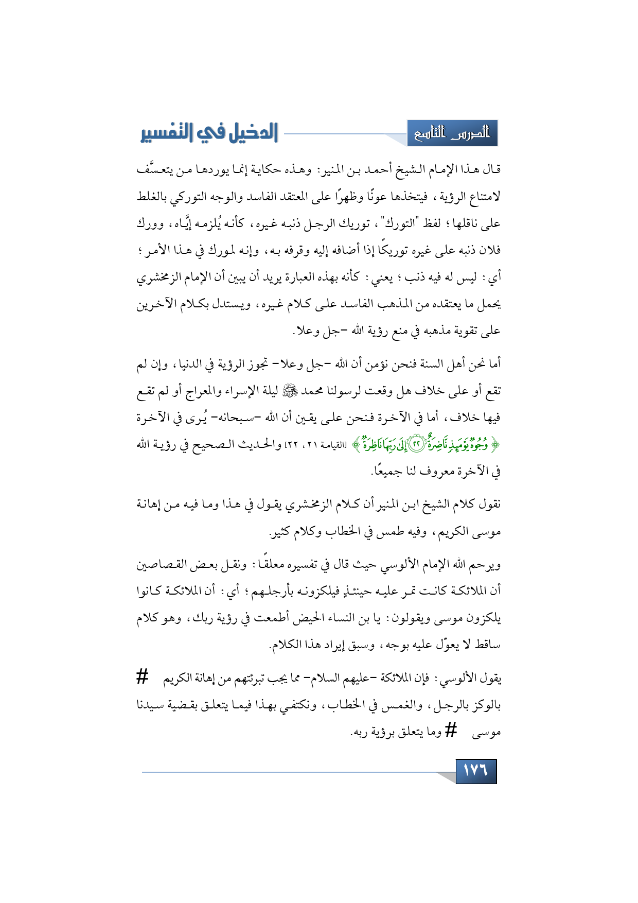 قال هذا الإمام الشيخ أحمد بن المنير: وهذه حكاية إنما يوردها من يتعسَّف لامتناع الرؤية، فيتخذها عونًا وظهرًا على المعتقد الفاسد والوجه التوركي بالغلط على ناقلها؛ لفظ " التورك "، توريك الرجل ذنبه غيره، كأنه يُلزمه إيَّاه، وورك فلان ذنبه على غيره توريكًا إذا أضافه إليه وقرفه به، وإنه لمورك في هذا الأمر؛ أي: ليس له فيه ذنب؛ يعني: كأنه بهذه العبارة يريد أن يبين أن الإمام الزمخشري يحمل ما يعتقده من المذهب الفاسد على كلام غيره، ويستدل بكلام الآخرين على تقوية مذهبه في منع رؤية الله - جل وعلا.