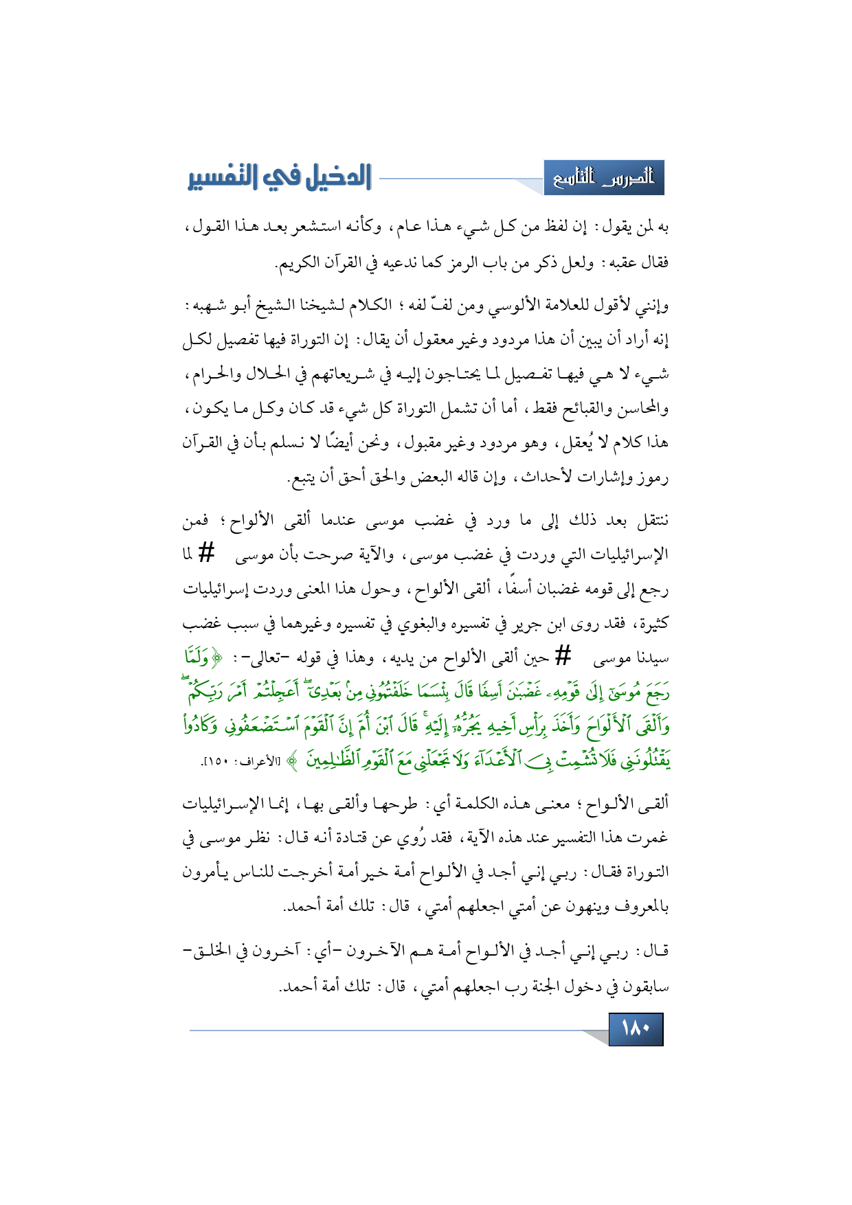 وإنني لأقول للعلامة ال ألوسي ومن لفّ لفه؛ الكلام لشيخنا الشيخ أبو شهبه: إنه أراد أن يبين أن هذا مردود وغير معقول أن يقال: إن التوراة فيها تفصيل لكل شيء لا هي فيها تفصيل لما يحتاجون إليه في شريعاتهم في الحلال والحرام، والمحاسن والقبائح فقط، أما أن تشمل التوراة كل شيء قد كان وكل ما يكون، هذا كلام لا يُعقل، وهو مردود وغير مقبول، ونحن أيضًا لا نسلم بأن في القرآن رموز وإشارات لأحداث، وإن قاله البعض والحق أحق أن يتبع.