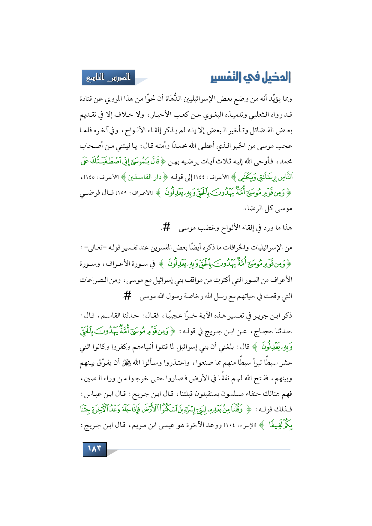 من الإسرائيليات والخرافات ما ذكره أيض ً ابعض المفسرين عند تفسير قوله - تعالى -: {وَمِنْ قَوْمِ مُوسَى أُمَّةٌ يَهْدُونَ بِالْحَقِّ وَبِهِ يَعْدِلُونَ} في سورة الأعراف، وسورة الأعراف من السور التي أكثرت من مواقف بني إسرائيل مع موسى، ومن الصراعات التي وقعت في حياتهم مع رسل الله وخاصة رسول الله موسى -عليه السلام.