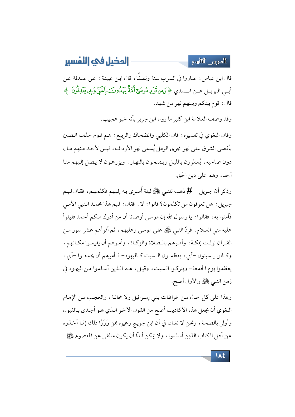 وذكر أن جبريل -عليه السلام- ذهب للنبي -صلى الله عليه وسلم- ليلة أُسري به إليهم فكلمهم، فقال لهم جبريل: هل تعرفون من تكلمون؟ قالوا: لا، فقال: لهم هذا محمد النبي الأمي فآمنوا به، فقالوا: يا رسول الله إن موسى أوصانا أن من أدرك منكم أحمد فليقرأ عليه مني السلام، فردّ النبي -صلى الله عليه وسلم- على موسى وعليهم، ثم أقرأهم عشر سور من القرآن نزلت بمكة، وأمرهم بالصلاة والزكاة، وأمرهم أن يقيموا مكانهم، وكانوا يسبتون -أي: يعظمون السبت كاليهود- فأمرهم أن يجمعوا -أي: يعظموا يوم الجمعة- ويتركوا السبت، وقيل: هم الذين أسلموا من اليهود في زمن النبي -صلى الله عليه وسلم- والأول أصح.