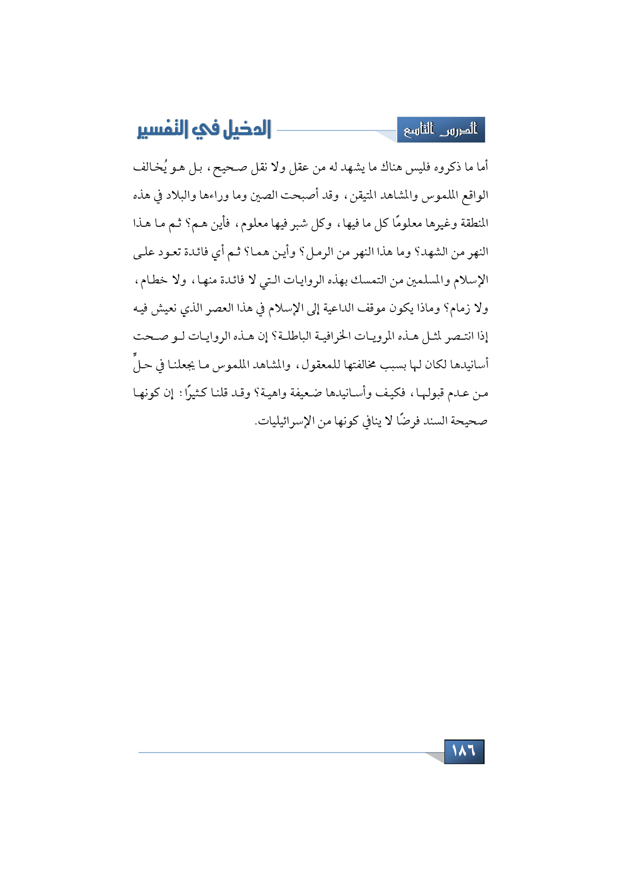أما ما ذكروه فليس هناك ما يشهد له من عقل ولا نقل صحيح، بل هو يُخالف الواقع الملموس والمشاهد المتيقن، وقد أصبحت الصين وما وراءها والبلاد في هذه المنطقة وغيرها معلومًا كل ما فيها، وكل شبر فيها معلوم، فأين هم؟ ثم ما هذا النهر من الشهد؟ وما هذا النهر من الرمل؟ وأين هما؟ ثم أي فائدة تعود على الإسلام والمسلمين من التمسك بهذه الروايات التي لا فائدة منها، ولا خطام، ولا زمام؟ وماذا يكون موقف الداعية إلى الإسلام في هذا العصر الذي نعيش فيه إذا انتصر لمثل هذه المرويات الخرافية الباطلة؟ إن هذه الروايات لو صحت أسانيدها لكان لها بسبب مخالفتها للمعقول، والمشاهد الملموس ما يجعلنا في حلٍّ من عدم قبولها، فكيف وأسانيدها ضعيفة واهية؟ وقد قلنا كثيرًا: إن كونها صحيحة السند فرضًا لا ينافي كونها من الإسرائيليات.