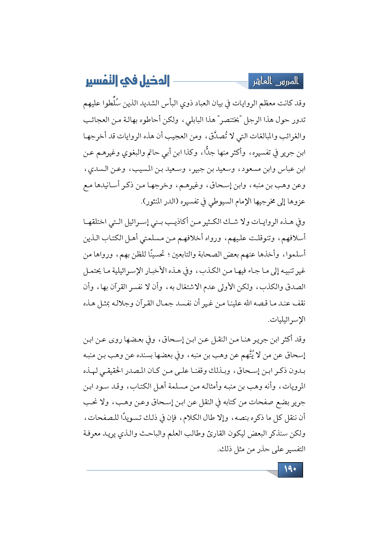 وقد أكثر ابن جرير هنا من النقل عن ابن إسحاق، وفي بعضها روى عن ابن إسحاق عن من لا يُتَّهم عن وهب بن منبه، وفي بعضها بسنده عن وهب بن منبه بدون ذكر ابن إسحاق، وبذلك وقفنا على من كان المصدر الحقيقي لهذه المرويات، وأنه وهب بن منبه وأمثاله من مسلمة أهل الكتاب, وقد سود ابن جرير بضع صفحات من كتابه في النقل عن ابن إسحاق وعن وهب، ولا نحب أن ننقل كل ما ذكره بنصه، وإلا طال الكلام، فإن في ذلك تسويدًا للصفحات، ولكن سنذكر البعض ليكون القارئ وطالب العلم والباحث والذي يريد معرفة التفسير على حذر من مثل ذلك.