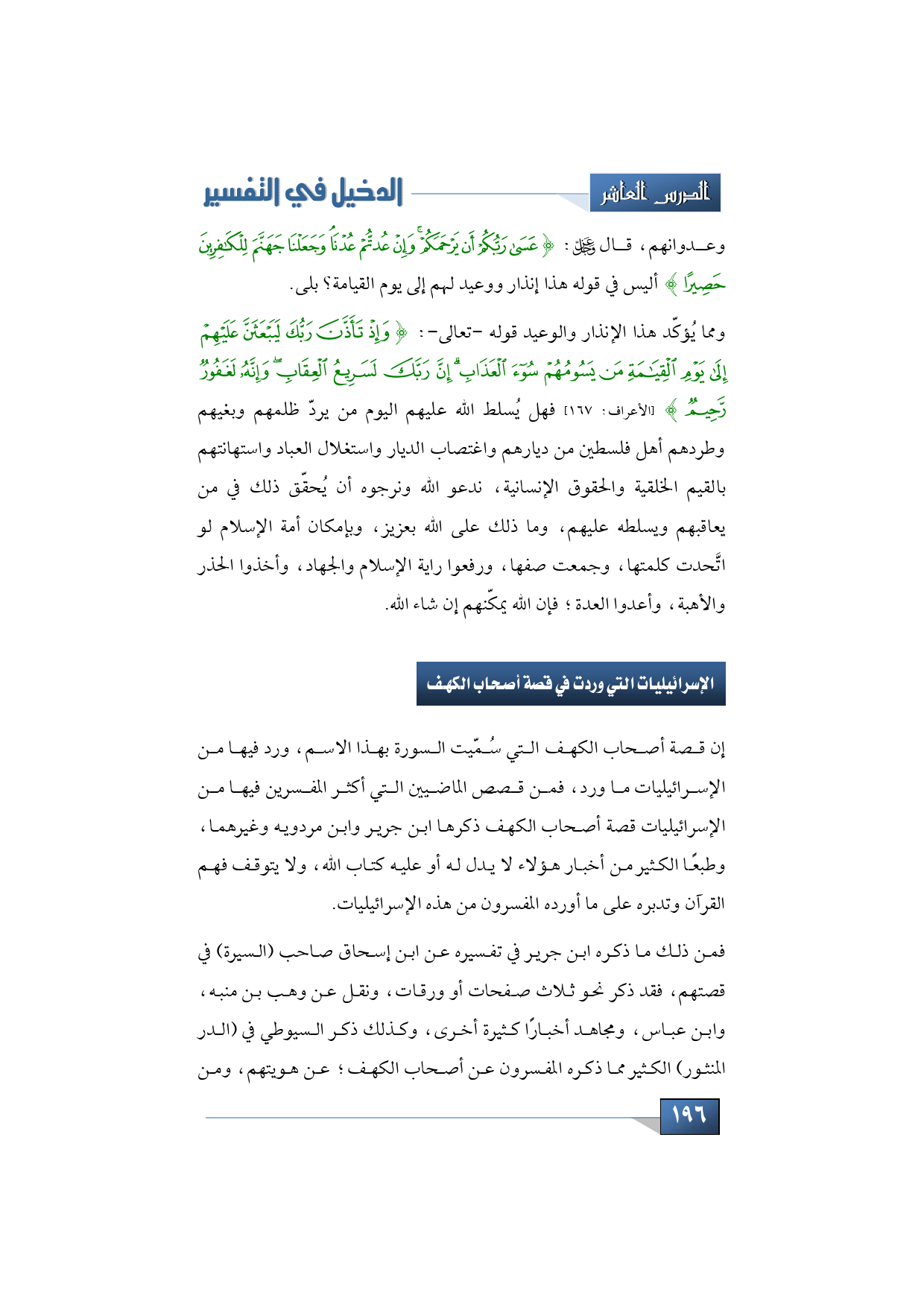 إن قصة أصحاب الكهف التي سُمّيت السورة بهذا الاسم، ورد فيها من الإسرائيليات ما ورد، فمن قصص الماضيين التي أكثر المفسرين فيها من الإسرائيليات قصة أصحاب الكهف ذكرها ابن جرير وابن مردويه وغيرهما، وطبع ً االكثير من أخبار هؤلاء لا يدل له أو عليه كتاب الله، ولا يتوقف فهم القرآن وتدبره على ما أورده المفسرون من هذه الإسرائيليات.