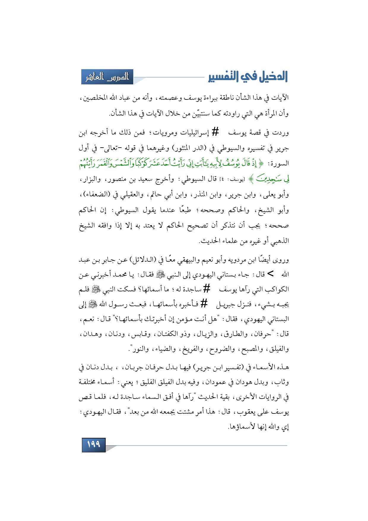 وروى أيضًا ابن مردويه وأبو نعيم والبيهقي معًا في (الدلائل) عن جابر بن عبد الله -رضي الله عنه- قال: جاء بستاني اليهودي إلى النبي -صلى الله عليه وسلم- فقال: يا محمد أخبرني عن الكواكب التي رآها يوسف -عليه السلام- ساجدة له؛ ما أسمائها؟ فسكت النبي -صلى الله عليه وسلم- فلم يجبه بشيء، فنزل جبريل -عليه السلام- فأخبره بأسمائها، فبعث رسول ال ل هـ -صلى الله عليه وسلم- إلى البستاني اليهودي، فقال: " هل أنت مؤمن إن أخبرتك بأسمائها؟ " قال: نعم، قال: " حرفان، والطارق، والزيال، وذو الكفتا ن، وقابس، ودنان، وهدان، والفيلق، والمصبح، والضروح، والفريخ، والضياء، والنور".