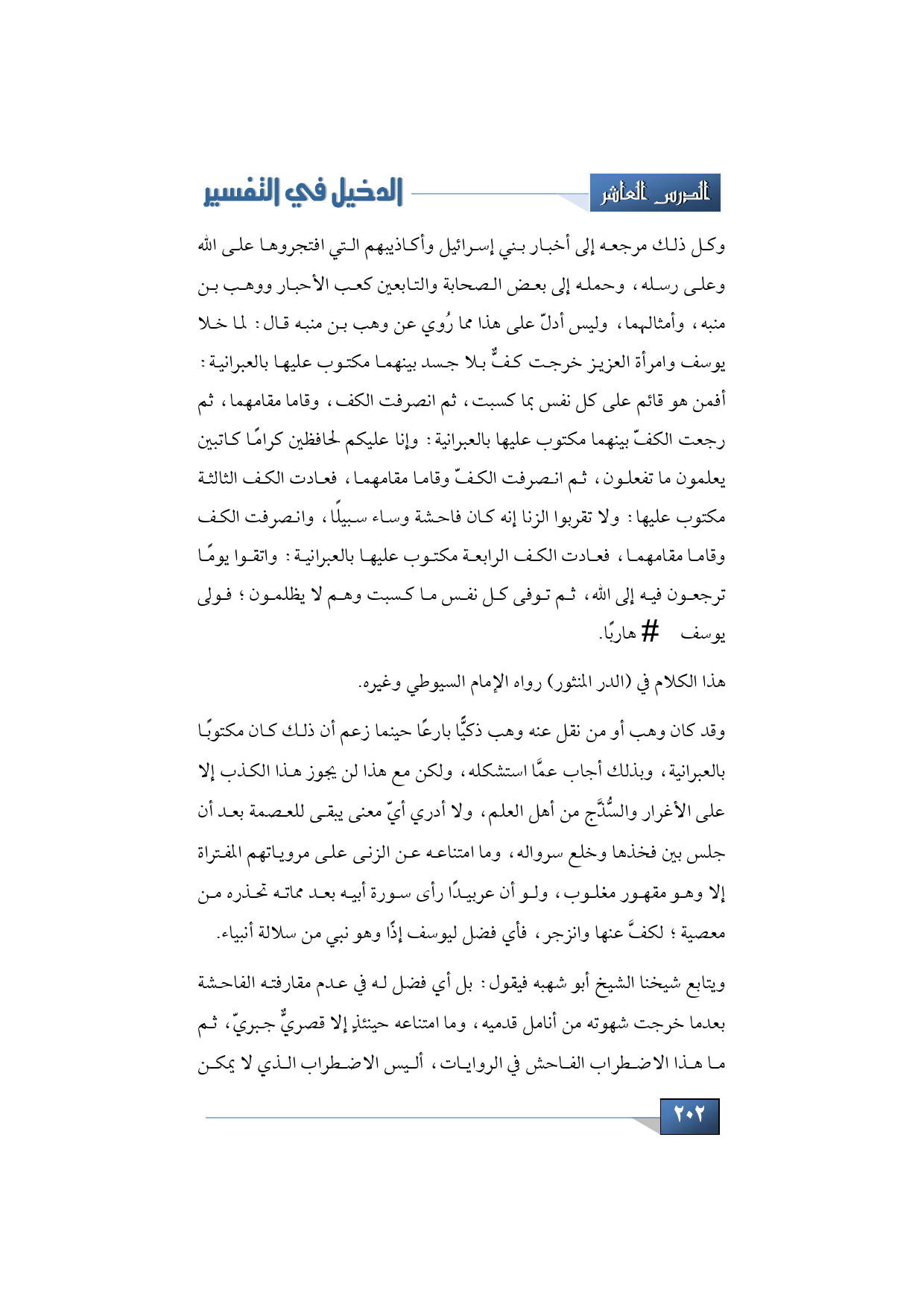 وكل ذلك مرجعه إلى أخبار بني إسرائيل وأكاذيبهم التي افتجروها على الله وعلى رسله، وحمله إلى بعض الصحابة والتابعين كعب الأحبار ووهب بن منبه، وأمثالهما، وليس أدلّ على هذا مما رُوي عن وهب بن منبه قال: لما خلا يوسف وامرأة العزيز خرجت كفٌّ بلا جسد بينهما مكتوب عليها بالعبرانية: أفمن هو قائم على كل نفس بما كسبت، ثم انصرفت الكف، وقاما مقامهما، ثم رجعت الكفّ بينهما مكتوب عليها بالعبرانية: وإنا عليكم لحافظين كرامًا كاتبين يعلمون ما تفعلون، ثم انصرفت الكفّ وقاما مقامهما، فعادت الكف الثالثة مكتوب عليها: ولا تقربوا الزنا إنه كان فاحشة وساء سبيلًا، وانصرفت الكف وقاما مقامهما، فعادت الكف الرابعة مكتوب عليها بالعبرانية: واتقوا يومًا ترجعون فيه إلى الله، ثم توفى كل نفس ما كسبت وهم لا يظلمون؛ فولى يوسف -عليه السلام- هاربًا.