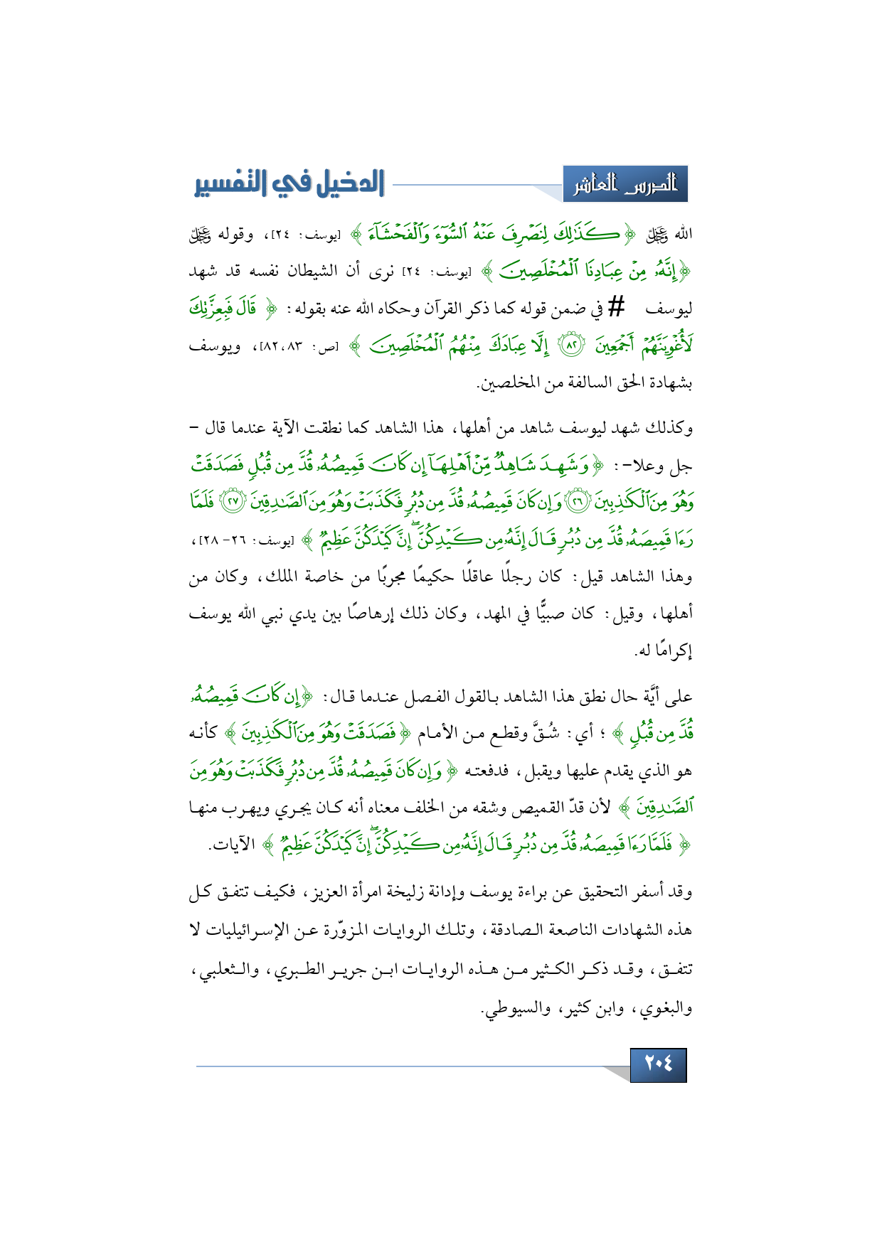 على أيَّة حال نطق هذا الشاهد بالقول الفصل عندما قال: {إِنْ كَانَ قَمِيصُهُ قُدَّ مِنْ قُبُلٍ}؛ أي: شُقَّ وقطع من الأمام {فَصَدَقَتْ وَهُوَ مِنَ الْكَاذِبِينَ} كأنه هو الذي يقدم عليها ويقبل، فدفعته {وَإِنْ كَانَ قَمِيصُهُ قُدَّ مِنْ دُبُرٍ فَكَذَبَتْ وَهُوَ مِنَ الصَّادِقِينَ} لأن قدّ القميص وشقه من الخلف معناه أنه كان يجري ويهرب منها {فَلَمَّا رَأَى قَمِيصَهُ قُدَّ مِنْ دُبُرٍ قَالَ إِنَّهُ مِنْ كَيْدِكُنَّ إِنَّ كَيْدَكُنَّ عَظِيمٌ} الآيات.