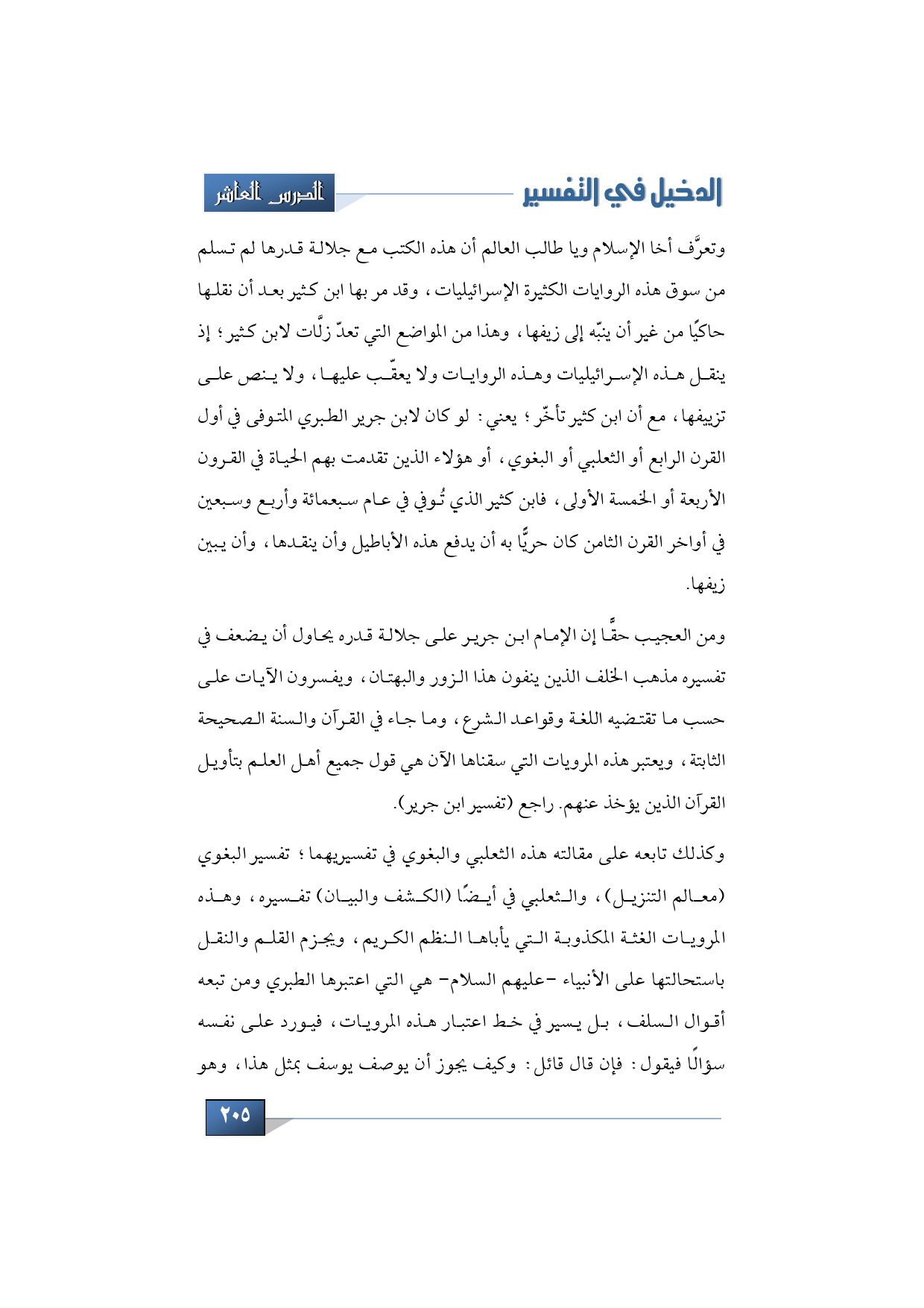 وكذلك تابعه على مقالته هذه الثعلبي والبغوي في تفسيريهما؛ تفسير البغوي (معالم التنزيل)، والثعلبي في أيضًا (الكشف والبيان) تفسيره، وهذه المرويات الغثة المكذوبة التي يأباها النظم الكريم، ويج ز م القلم والنقل باستحالتها على الأنبياء -عليهم السلام - هي التي اعتبرها الطبري ومن تبعه أقوال السلف, بل يسير في خط اعتبار هذه المرويات، فيورد على نفسه سؤالًا فيقول: فإن قال قائل: وكيف يجوز أن يوصف يوسف بمثل هذا، وهو