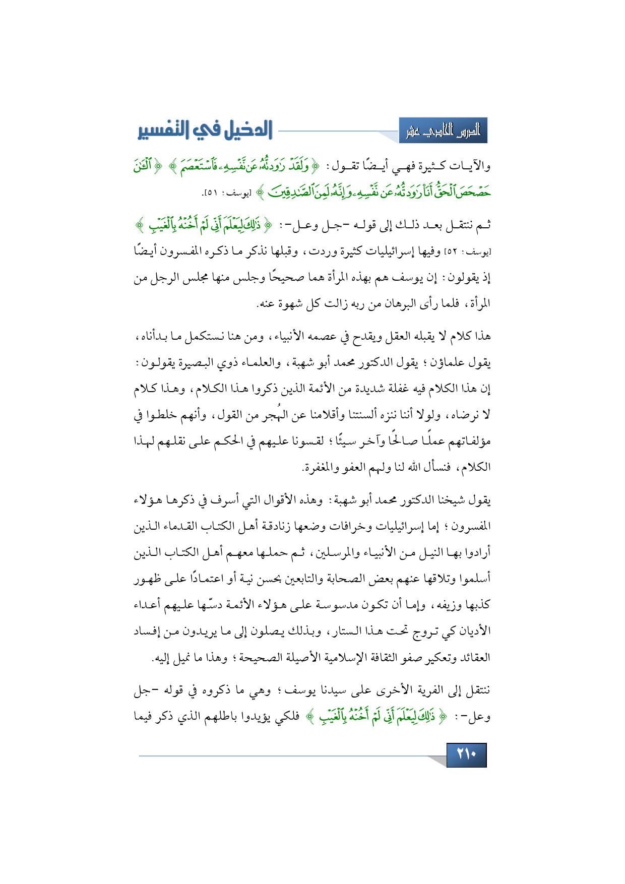 ثم ننتقل بعد ذلك إلى قوله -جل وعل-: {ذَلِكَ لِيَعْلَمَ أَنِّي لَمْ أَخُنْهُ بِالْغَيْبِ} (يوسف: 52) وفيها إسرائيليات كثيرة وردت، وقبلها نذكر ما ذكره المفسرون أيضًا إذ يقولون: إن يوسف هم بهذه المرأة هما صحيحًا وجلس منها مجلس الرجل من المرأة، فلما رأى البرهان من ربه زالت كل شهوة عنه.