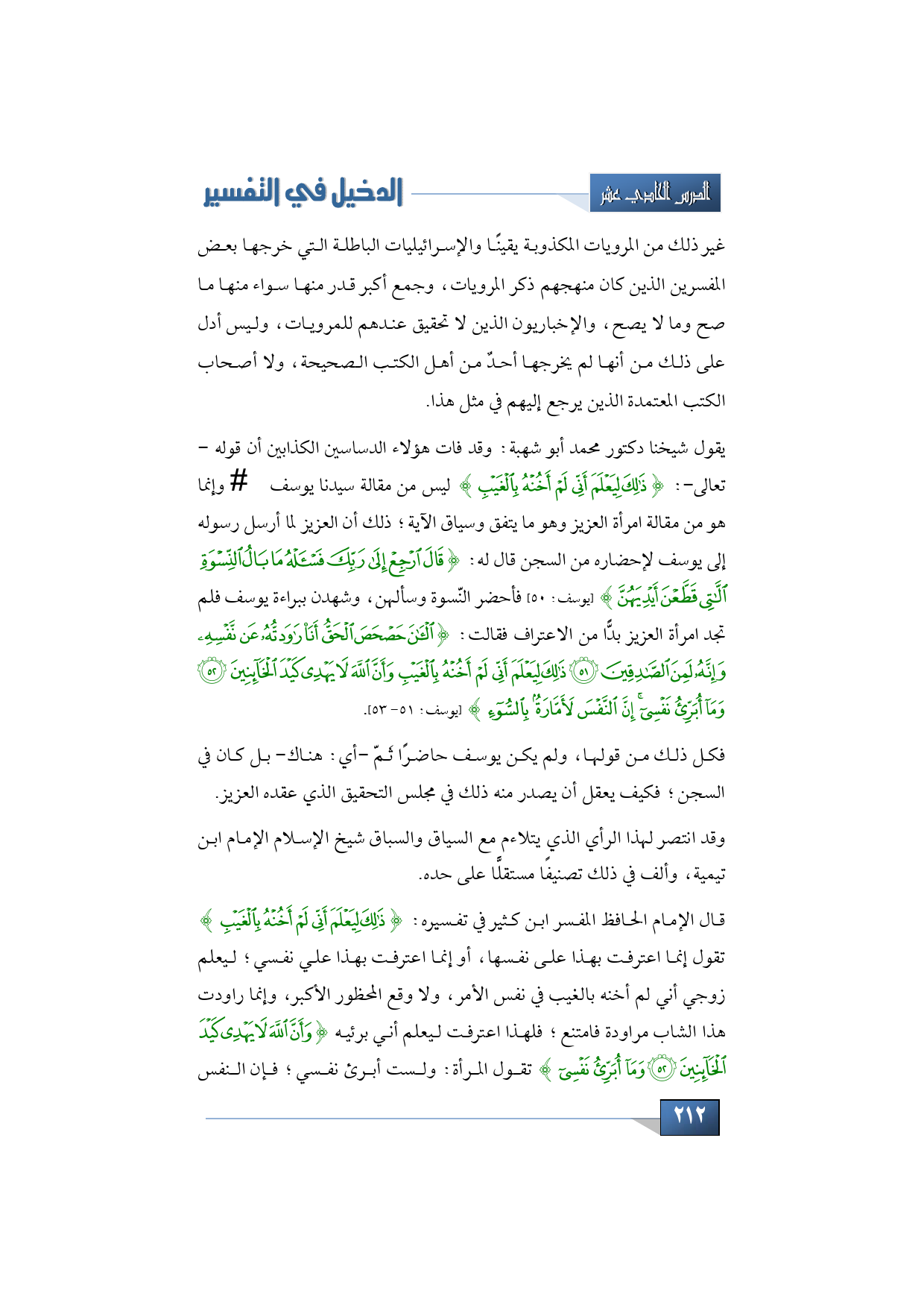 يقول شيخنا دكتور محمد أبو شهبة: وقد فات هؤلاء الدساسين الكذابين أن قوله -تعالى-: {ذَلِكَ لِيَعْلَمَ أَنِّي لَمْ أَخُنْهُ بِالْغَيْبِ} ليس من مقالة سيدنا يوسف -عليه السلام- وإنما هو من مقالة امرأة العزيز وهو ما يتفق وسياق الآية؛ ذلك أن العزيز لما أرسل رسوله إلى يوسف لإحضاره من السجن قال له: {قَالَ ارْجِعْ إلى رَبِّكَ فَاسْأَلْهُ مَا بَالُ النِّسْوَةِ اللَّاتِي قَطَّعْنَ أَيْدِيَهُنَّ} (يوسف: 50) فأحضر النّسوة وسألهن، وشهدن ببراءة يوسف فلم تجد امرأة العزيز بدًّا من الاعتراف فقالت: {الآنَ حَصْحَصَ الْحَقُّ أَنَا رَاوَدتُّهُ عَنْ نَفْسِهِ وَإِنَّهُ لَمِنْ الصَّادِقِينَ * ذَلِكَ لِيَعْلَمَ أَنِّي لَمْ أَخُنْهُ بِالْغَيْبِ وَأَنَّ اللَّهَ لا يَهْدِي كَيْدَ الْخَائِنِينَ * وَمَا أُبَرِّئُ نَفْسِي إِنَّ النَّفْسَ لأَمَّارَةٌ بِالسُّوءِ} (يوسف: 51 - 53).