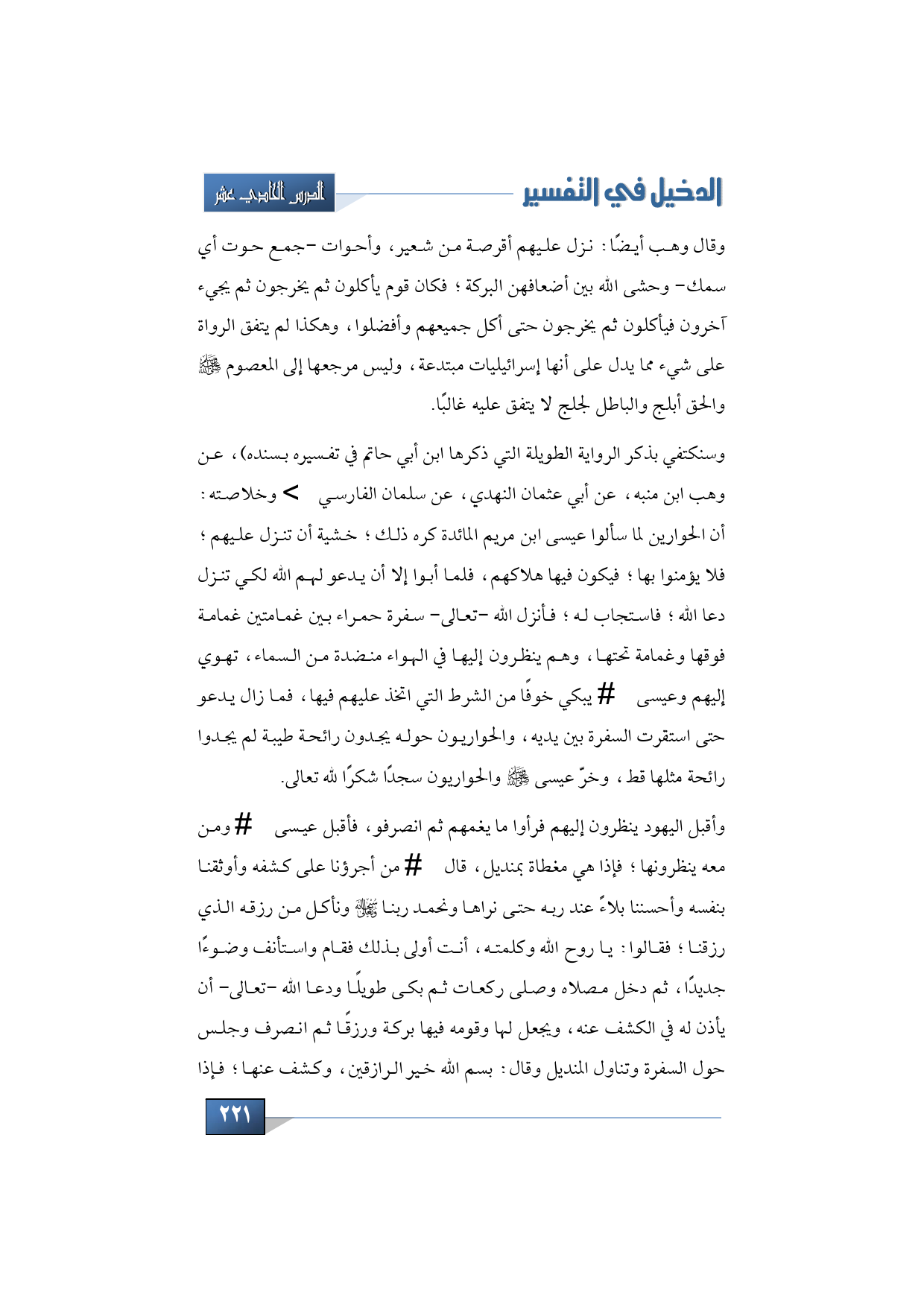 وقال وهب أيضًا: نزل عليهم أقرصة من شعير، وأحوات -جمع حوت أي سمك- وحشى الله بين أضعافهن البركة؛ فكان قوم يأكلون ثم يخرجون ثم يجيء آخرون فيأكلون ثم يخرجون حتى أكل جميعهم وأفضلوا، وهكذا لم يتفق الرواة على شيء مما يدل على أنها إسرائيليات مبتدعة، وليس مرجعها إلى المعصوم -صلى الله عليه وسلم- والحق أبلج والباطل لجلج لا يتفق عليه غالبًا.