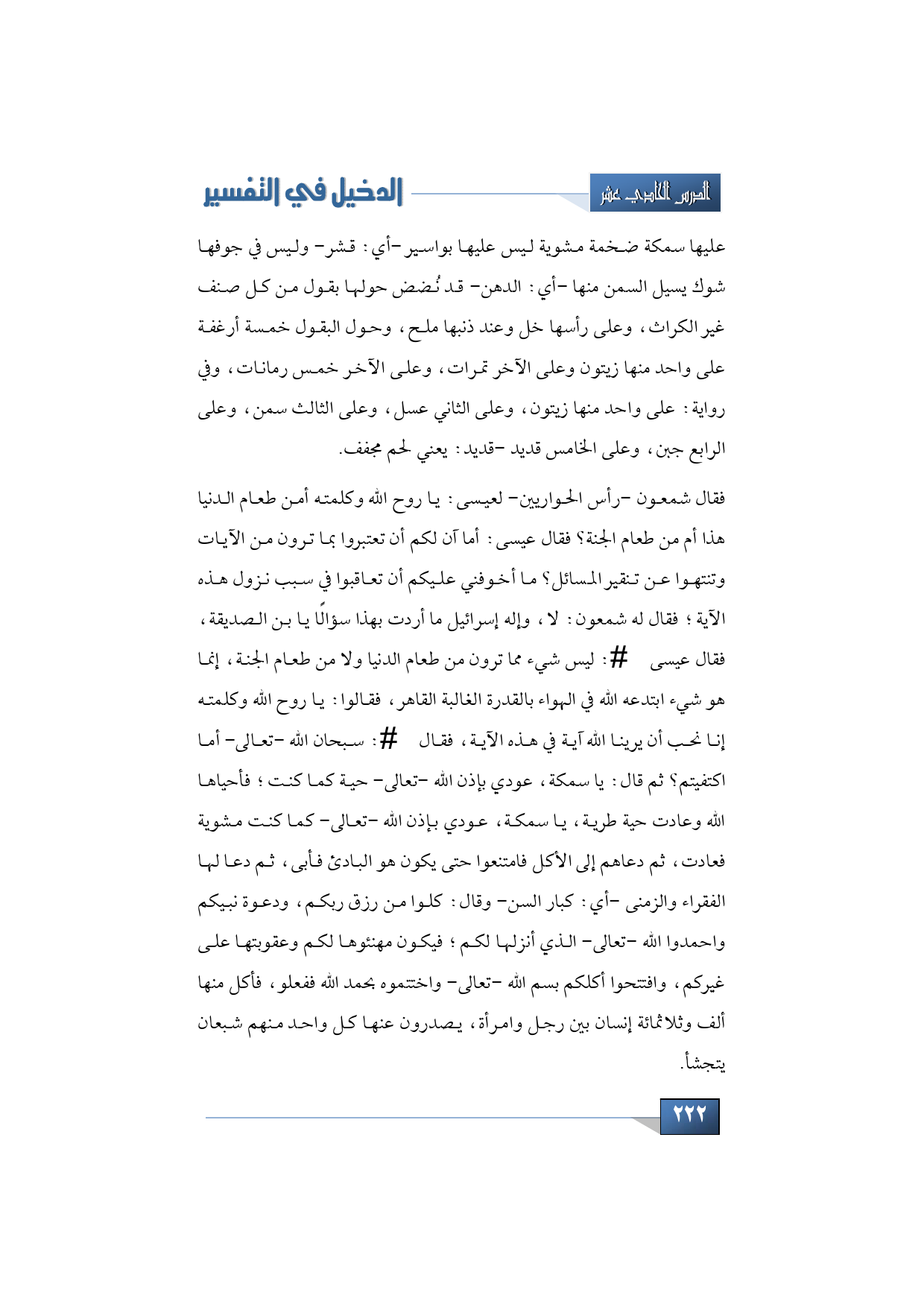 فقال شمعون -رأس الحواريين- لعيسى: يا روح الله وكلمته أمن طعام الدنيا هذا أم من طعام الجنة؟ فقال عيسى: أما آن لكم أن تعتبروا بما ترون من الآيات وتنتهوا عن تنقير المسائل؟ ما أخوفني عليكم أن تعاقبوا في سبب نزول هذه الآية؛ فقال له شمعون: لا، وإله إسرائيل ما أردت بهذا سؤالًا يا بن الصديقة، فقال عيسى -عليه السلام-: ليس شيء مما ترون من طعام الدنيا ولا من طعام الجنة، إنما هو شيء ابتدعه الله في الهواء بالقدرة الغالبة القاهر، فقالوا: يا روح الله وكلمته إنا نحب أن يرينا الله آية في هذه الآية، فقال -عليه السلام-: سبحان الله -تعالى- أما اكتفيتم؟ ثم قال: يا سمكة، عودي بإذن الله -تعالى- حية كما كنت؛ فأحياها الله وعادت حية طرية، يا سمكة، عودي بإذن الله -تعالى- كما كنت مشوية فعادت، ثم دعاهم إلى الأكل فامتنعوا حتى يكون هو البادئ فأبى، ثم دعا لها الفقراء والزمنى -أي: كبار السن- وقال: كلوا من رزق ربكم، ودعوة نبيكم واحمدوا الله -تعالى- الذي أنزلها لكم؛ فيكون مهنئوها لكم وعقوبتها على غيركم، وافتتحوا أكلكم بسم الله -تعالى- واختتموه بحمد الله ففعلو، فأكل منها ألف وثلاثمائة إنسان بين رجل وامرأة، يصدرون عنها كل واحد منهم شبعان يتجشأ.