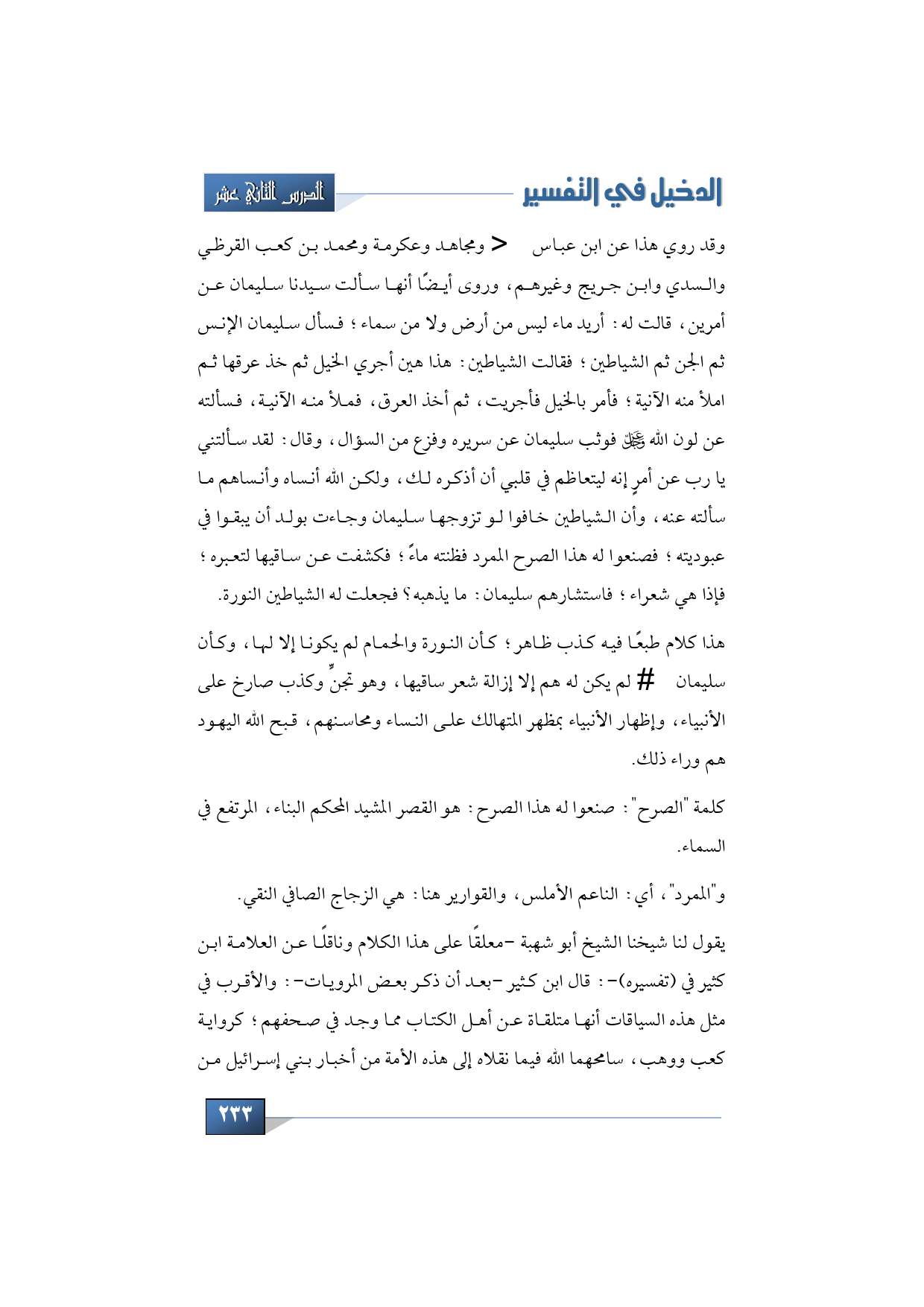 وقد روي هذا عن ابن عباس -رضي الله عنه ا - ومجاهد وعكرمة ومحمد بن كعب القرظي والسدي وابن جريج وغيرهم، وروى أيضًا أنها سألت سيدنا سليمان عن أمرين، قالت له: أريد ماء ليس من أرض ولا من سماء؛ فسأل سليمان الإنس ثم الجن ثم الشياطين؛ فقالت الشياطين: هذا هين أجري الخيل ثم خذ عرقها ثم املأ منه الآنية؛ فأمر بالخيل فأجريت، ثم أخذ العرق، فملأ منه الآنية، فسألته عن لون الله -عز وجل- فوثب سليمان عن سريره وفزع من السؤال، وقال: لقد سألتني يا رب عن أمرٍ إنه ليتعاظم في قلبي أن أذكره لك، ولكن الله أنساه وأنساهم ما سألته عنه، وأن الشياطين خافوا لو تزوجها سليمان وجاءت بولد أن يبقوا في عبوديته؛ فصنعوا له هذا الصرح الممرد فظنته ماءً؛ فكشفت عن ساقيها لتعبره؛ فإذا هي شعراء؛ فاستشارهم سليمان: ما يذهبه؟ فجعلت له الشياطين النورة.