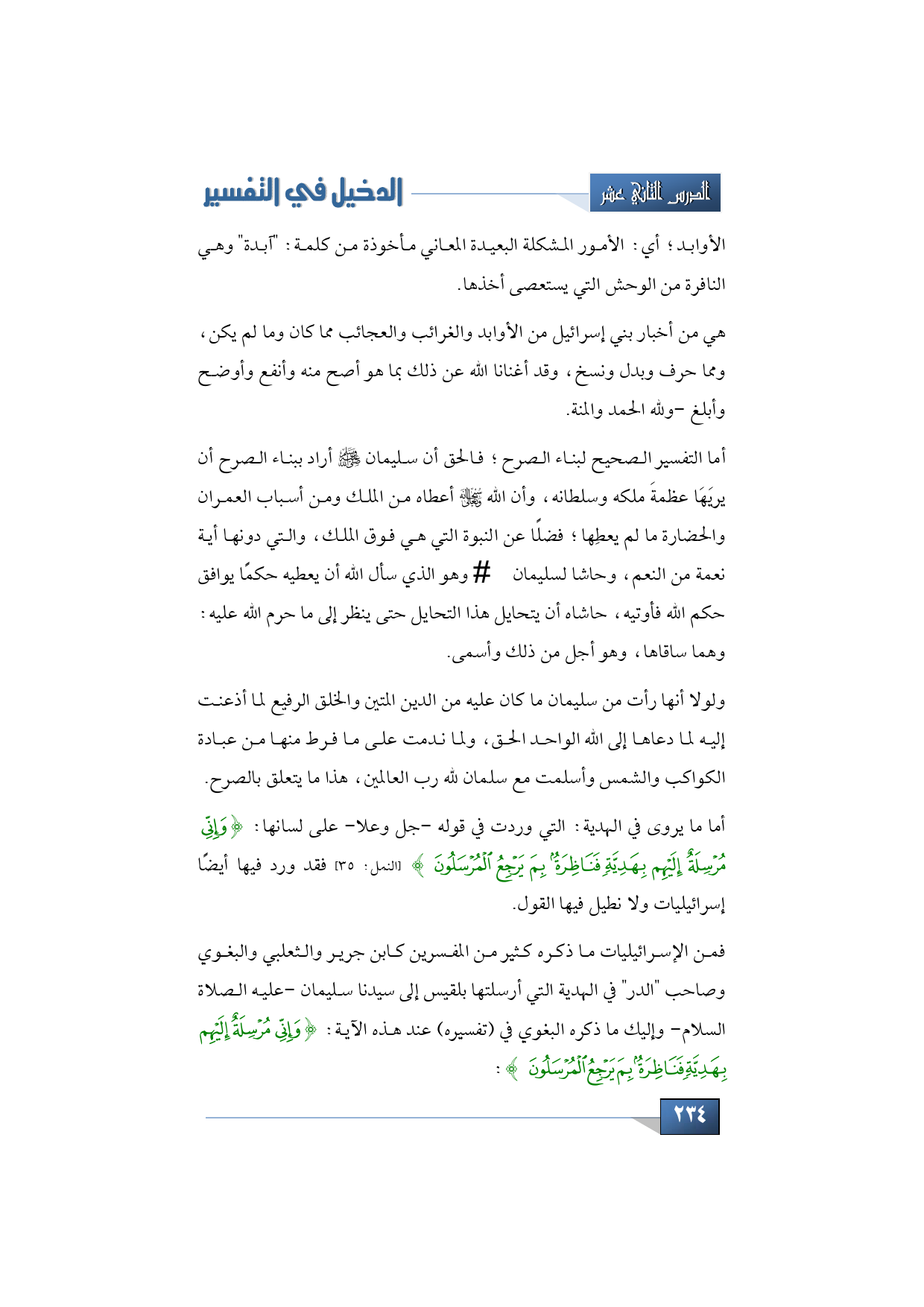 فمن الإسرائيليات ما ذكره كثير من المفسرين كابن جرير والثعلبي والبغوي وصاحب "الدر" في الهدية التي أرسلتها بلقيس إلى سيدنا سليمان -عليه الصلاة السلام- وإليك ما ذكره البغوي في (تفسيره) عند هذه الآية: {وَإِنِّي مُرْسِلَةٌ إِلَيْهِمْ بِهَدِيَّةٍ فَنَاظِرَةٌ بِمَ يَرْجِعُ الْمُرْسَلُونَ}: