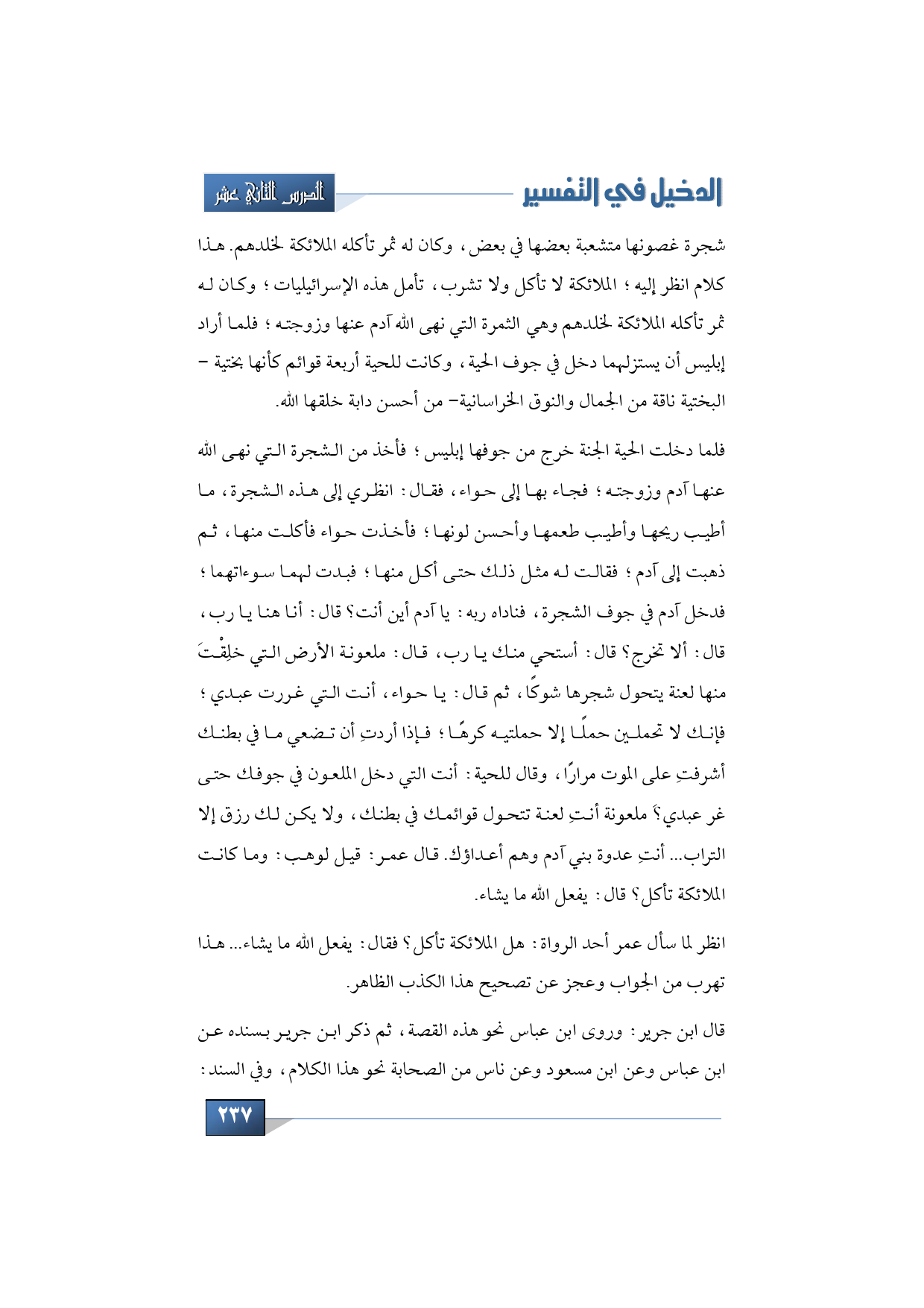 شجرة غصونها متشعبة بعضها في بعض، وكان له ثمر تأكله الملائكة لخلدهم. هذا كلام انظر إليه؛ الملائكة لا تأكل ولا تشرب، تأمل هذه الإسرائيليات؛ وكان له ثمر تأكله الملائكة لخلدهم وهي الثمرة التي نهى الله آدم عنها وزوجته؛ فلما أراد إبليس أن يستزلهما دخل في جوف الحية، وكانت للحية أربعة قوائم كأنها بختية -البختية ناقة من الجمال والنوق الخراسانية- من أحسن دابة خلقها الله.