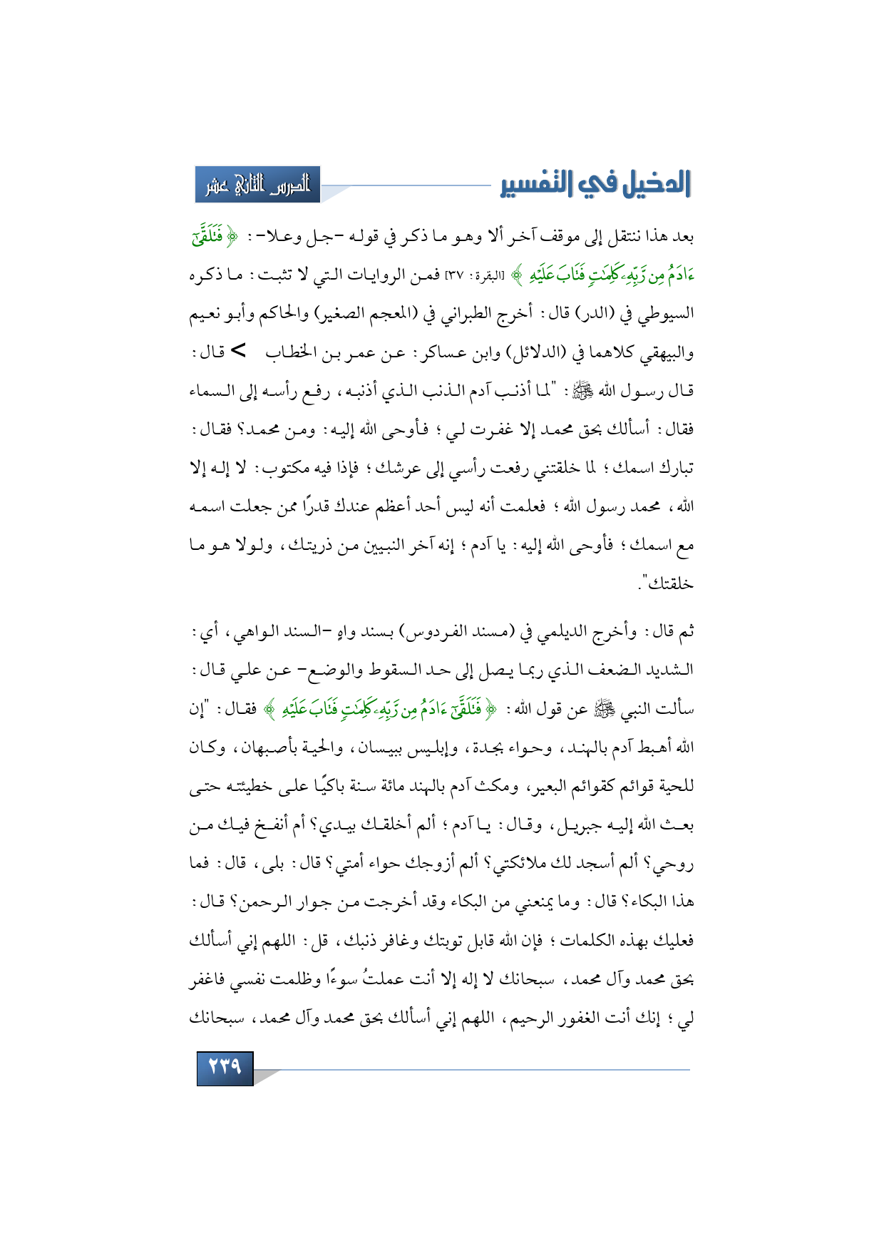 ثم قال: وأخرج الديلمي في (مسند الفردوس) بسند واهٍ -السند الواهي، أي: الشديد الضعف الذي ربما يصل إلى حد السقوط والوضع- عن علي قال: سألت النبي -صلى الله عليه وسلم- عن قول الله: {فَتَلَقَّى آدَمُ مِن رَّبِّهِ كَلِمَاتٍ فَتَابَ عَلَيْهِ} فقال: " إن الله أهبط آدم بالهند، وحواء بجدة، وإبليس ببيسان، والحية بأصبهان، وكان للحية قوائم كقوائم البعير، ومكث آدم بالهند مائة سنة باكيًا على خطيئته حتى بعث الله إليه جبريل، وقال: يا آدم؛ ألم أخلقك بيدي؟ أم أنفخ فيك من روحي؟ ألم أسجد لك ملائكتي؟ ألم أزوجك حواء أمتي؟ قال: بلى، قال: فما هذا البكاء؟ قال: وما يمنعني من البكاء وقد أخرجت من جوار الرحمن؟ قال: فعليك بهذه الكلمات؛ فإن الله قابل توبتك وغافر ذنبك، قل: اللهم إني أسألك بحق محمد وآل محمد، سبحانك لا إله إلا أنت عملتُ سوءًا وظلمت نفسي فاغفر لي؛ إنك أنت الغفور الرحيم، اللهم إني أسألك بحق محمد وآل محمد، سبحانك