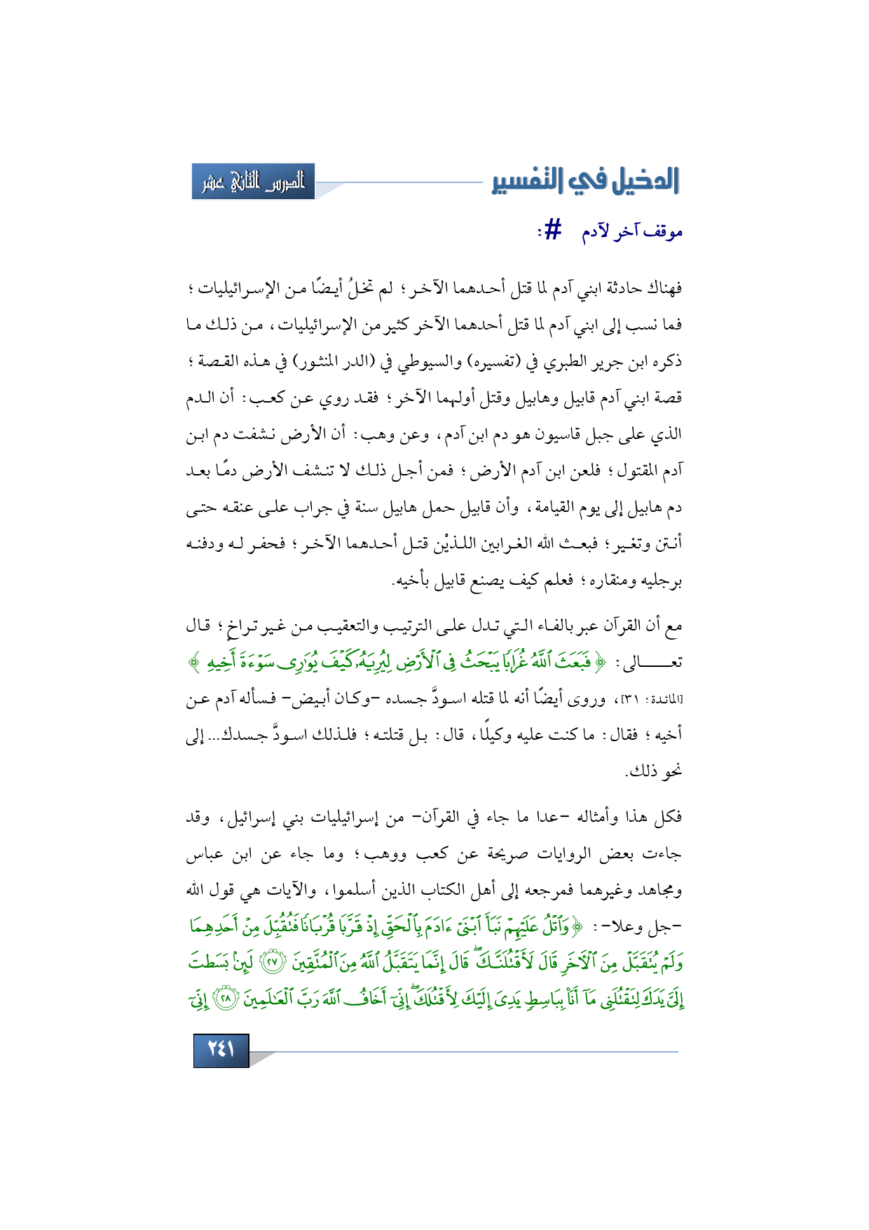 فكل هذا وأمثاله -عدا ما جاء في القرآن- من إسرائيليات بني إسرائيل، وقد جاءت بعض الروايات صريحة عن كعب ووهب؛ وما جاء عن ابن عباس ومجاهد وغيرهما فمرجعه إلى أهل الكتاب الذين أسلموا، والآيات هي قول الله -جل وعلا-: {وَاتْلُ عَلَيْهِمْ نَبَأَ ابْنَيْ آدَمَ بِالْحَقِّ إِذْ قَرَّبَا قُرْبَانًا فَتُقُبِّلَ مِن أَحَدِهِمَا وَلَمْ يُتَقَبَّلْ مِنَ الآخَرِ قَالَ لَأَقْتُلَنَّكَ قَالَ إِنَّمَا يَتَقَبَّلُ اللهُ مِنَ الْمُتَّقِين * لَئِن بَسَطتَ إِلَيَّ يَدَكَ لِتَقْتُلَنِي مَا أَنَاْ بِبَاسِطٍ يَدِيَ إِلَيْكَ لِأَقْتُلَكَ إِنِّي أَخَافُ اللهَ رَبَّ الْعَالَمِين، إِنِّي
