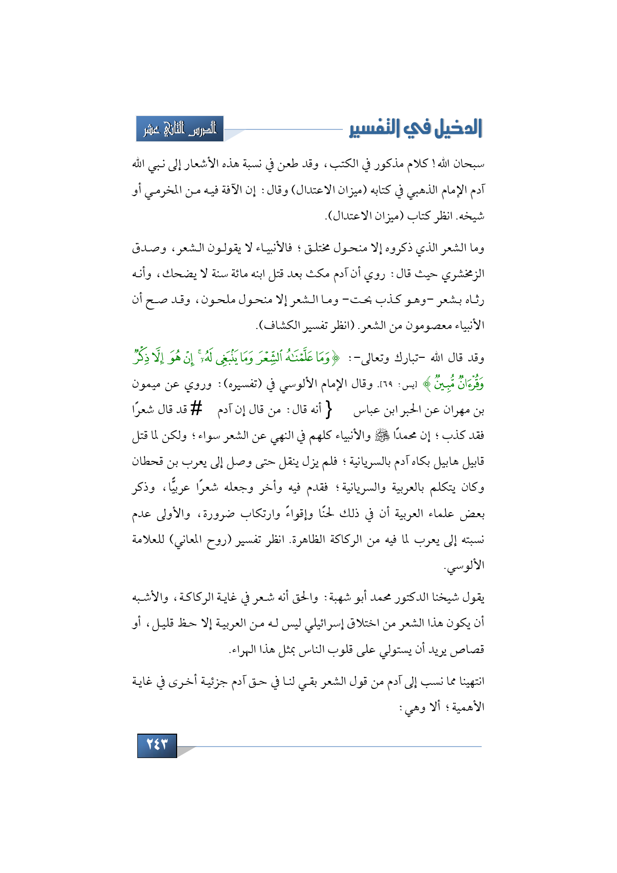 وما الشعر الذي ذكروه إلا منحول مختلق؛ فالأنبياء لا يقولون الشعر، وصدق الزمخشري حيث قال: روي أن آدم مكث بعد قتل ابنه مائة سنة لا يضحك، وأنه رثاه بشعر -وهو كذب بحت- وما الشعر إلا منحول ملحون، وقد صح أن الأنبياء معصومون من الشعر. (انظر تفسير الكشاف).