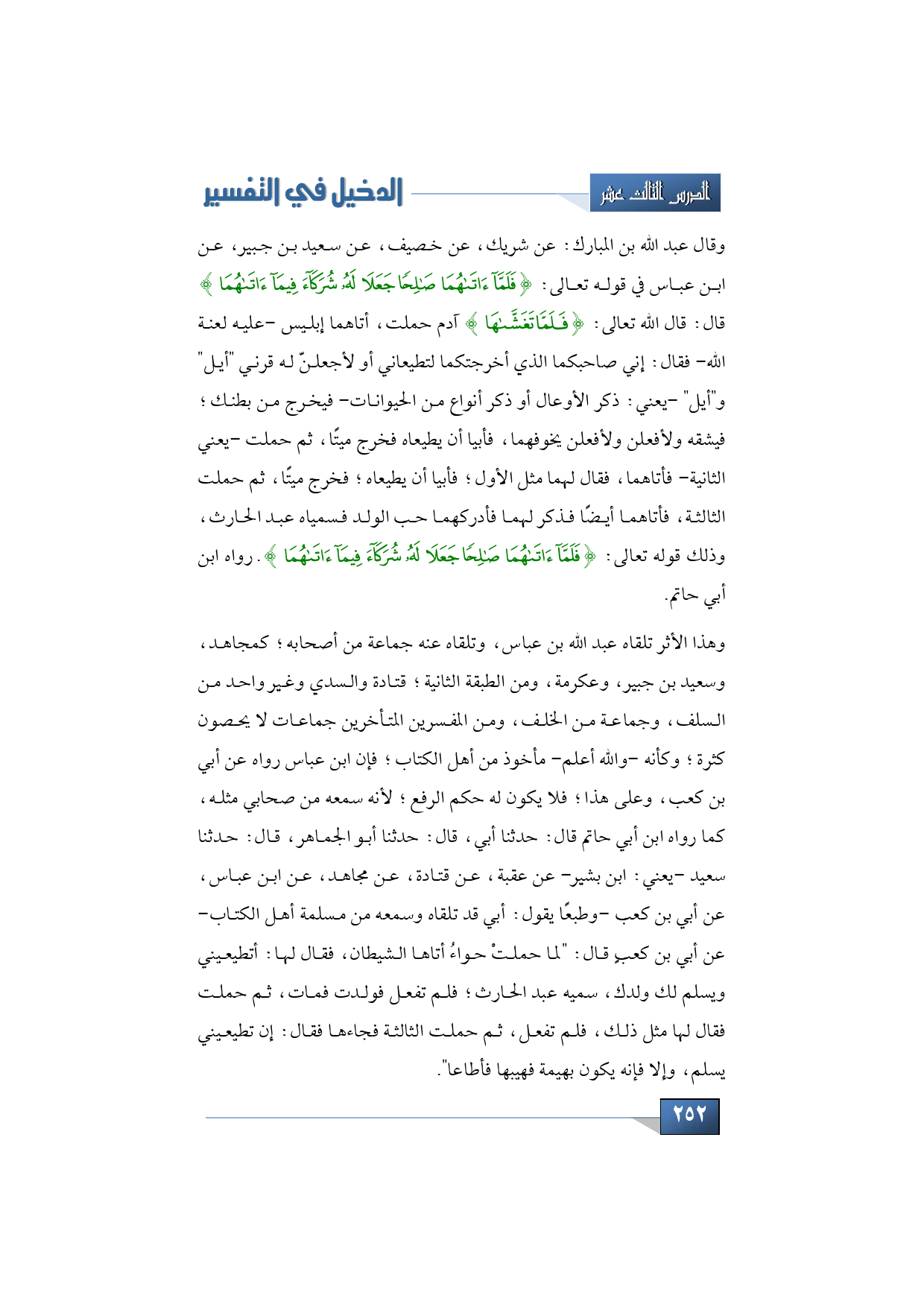 وهذا الأثر تلقاه عبد الله بن عباس، وتلقاه عنه جماعة من أصحابه؛ كمجاهد، وسعيد بن جبير، وعكرمة، ومن الطبقة الثانية؛ قتادة والسدي وغير واحد من السلف، وجماعة من الخلف، ومن المفسرين المتأخرين جماعات لا يحصون كثرة؛ وكأنه -والله أعلم- مأخوذ من أهل الكتاب؛ فإن ابن عباس رواه عن أبي بن كعب، وعلى هذا؛ فلا يكون له حكم الرفع؛ لأنه سمعه من صحابي مثله، كما رواه ابن أبي حاتم قال: حدثنا أبي، قال: حدثنا أبو الجماهر، قال: حدثنا سعيد -يعني: ابن بشير- عن عقبة، عن قتادة، عن مجاهد، عن ابن عباس، عن أبي بن كعب -وطبعًا يقول: أبي قد تلقاه وسمعه من مسلمة أهل الكتاب- عن أبي بن كعبٍ قال: "لما حملتْ حواءُ أتاها الشيطان، فقال لها: أتطيعيني ويسلم لك ولدك، سميه عبد الحارث؛ فلم تفعل فولدت فمات، ثم حملت فقال لها مثل ذلك، فلم تفعل، ثم حملت الثالثة فجاءها فقال: إن تطيعيني يسلم، وإلا فإنه يكون بهيمة فهيبها فأطاعا".