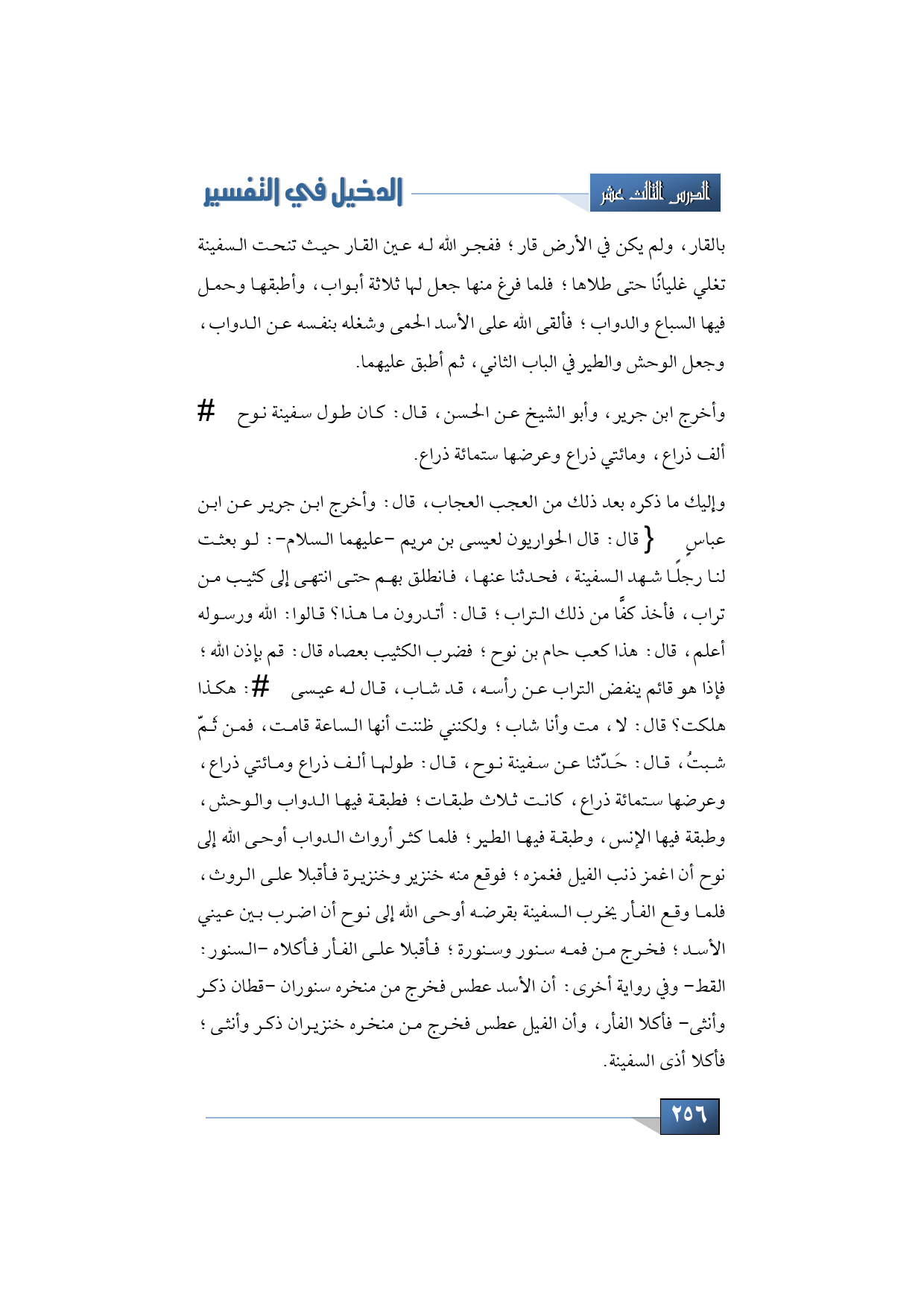 وإليك ما ذكره بعد ذلك من العجب العجاب، قال: وأخرج ابن جرير عن ابن عباسٍ -رضي الله عنهما- قال: قال الحواريون لعيسى بن مريم -عليه م االسلام-: لو بعثت لنا رجلًا شهد السفينة، فحدثنا عنها، فانطلق بهم حتى انتهى إلى كثيب من تراب، فأخذ كفًّا من ذلك التراب؛ قال: أتدرون ما هذا؟ قالوا: الله ورسوله أعلم، قال: هذا كعب حام بن نوح؛ فضرب الكثيب بعصاه قال: قم بإذن الله؛ فإذا هو قائم ينفض التراب عن رأسه، قد شاب، قال له عيسى -عليه السلام: هكذا هلكت؟ قال: لا، مت وأنا شاب؛ ولكنني ظننت أنها الساعة قامت، فمن ثَمّ شبتُ، قال: حَدّثنا عن سفينة نوح، قال: طولها ألف ذراع ومائتي ذراع، وعرضها ستمائة ذراع، كانت ثلاث طبقات؛ فطبقة فيها الدواب والوحش، وطبقة فيها الإنس، وطبقة فيها الطير؛ فلما كثر أرواث الدواب أوحى الله إلى نوح أن اغمز ذنب الفيل فغمزه؛ فوقع منه خنزير وخنزيرة فأقبلا على الروث، فلما وقع الفأر يخرب السفينة بقرضه أوحى الله إلى نوح أن اضرب بين عيني الأسد؛ فخرج من فمه سنور وسنورة؛ فأقبلا على الفأر فأكلاه -السنور: القط- وفي رواية أخرى: أن الأسد عطس فخرج من منخره سنوران -قطان ذكر وأنثى- فأكلا الفأر، وأن الفيل عطس فخرج من منخره خنزيران ذكر وأنثى؛ فأكلا أذى السفينة.