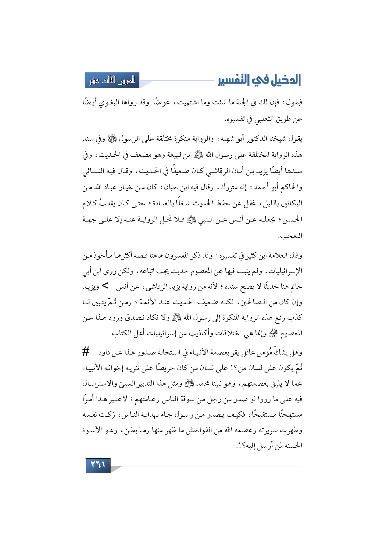 وقال العلامة ابن كثير في ت فسيره: وقد ذكر المفسرون هاهنا قصة أكثرها مأخوذ من الإسرائيليات، ولم يثبت فيها عن المعصوم حديث يجب اتباعه، ولكن روى ابن أبي حاتم هنا حديثًا لا يصح سنده؛ لأنه من رواية يزيد الرقاشي، عن أنس -رضي الله عنه- ويزيد وإن كان من الصالحين، لكنه ضعيف الحديث عند الأئمة؛ ومن ثَمّ يتبين لنا كذب رفع هذه الرواية المنكرة إلى رسول الله -صلى الله عليه وسلم- ولا نكاد نصدق ورود هذا عن المعصوم -عليه الصلاة والسلام- وإنما هي اختلاقات وأكاذيب من إسرائيليات أهل الكتاب.