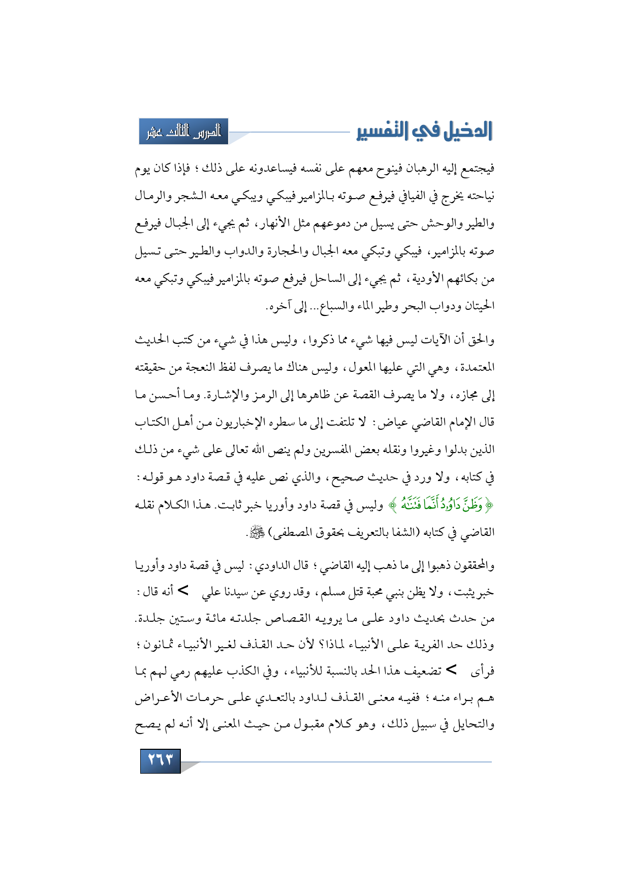 والحق أن الآيات ليس فيها شيء مما ذكروا، وليس هذا في شيء من كتب الحديث المعتمدة، وهي التي عليها المعول، وليس هناك ما يصرف لفظ النعجة من حقيقته إلى مجازه، ولا ما يصرف القصة عن ظاهرها إلى الرمز والإشارة. وما أحسن ما قال الإمام القاضي عياض: لا تلتفت إلى ما سطره الإخباريون من أهل الكتاب الذين بدلوا وغيروا ونقله بعض المفسرين ولم ينص الله تعالى على شيء من ذلك في كتابه، ولا ورد في حديث صحيح، والذي نص عليه في قصة داود هو قوله: {وَظَنَّ دَاوُودُ أَنَّمَا فَتَنَّاهُ} وليس في قصة داود وأوريا خبر ثابت. هذا الكلام نقله القاضي في كتابه (الشفا ب التعريف بحقوق المصطفى) - صلى الله عليه وسلم.