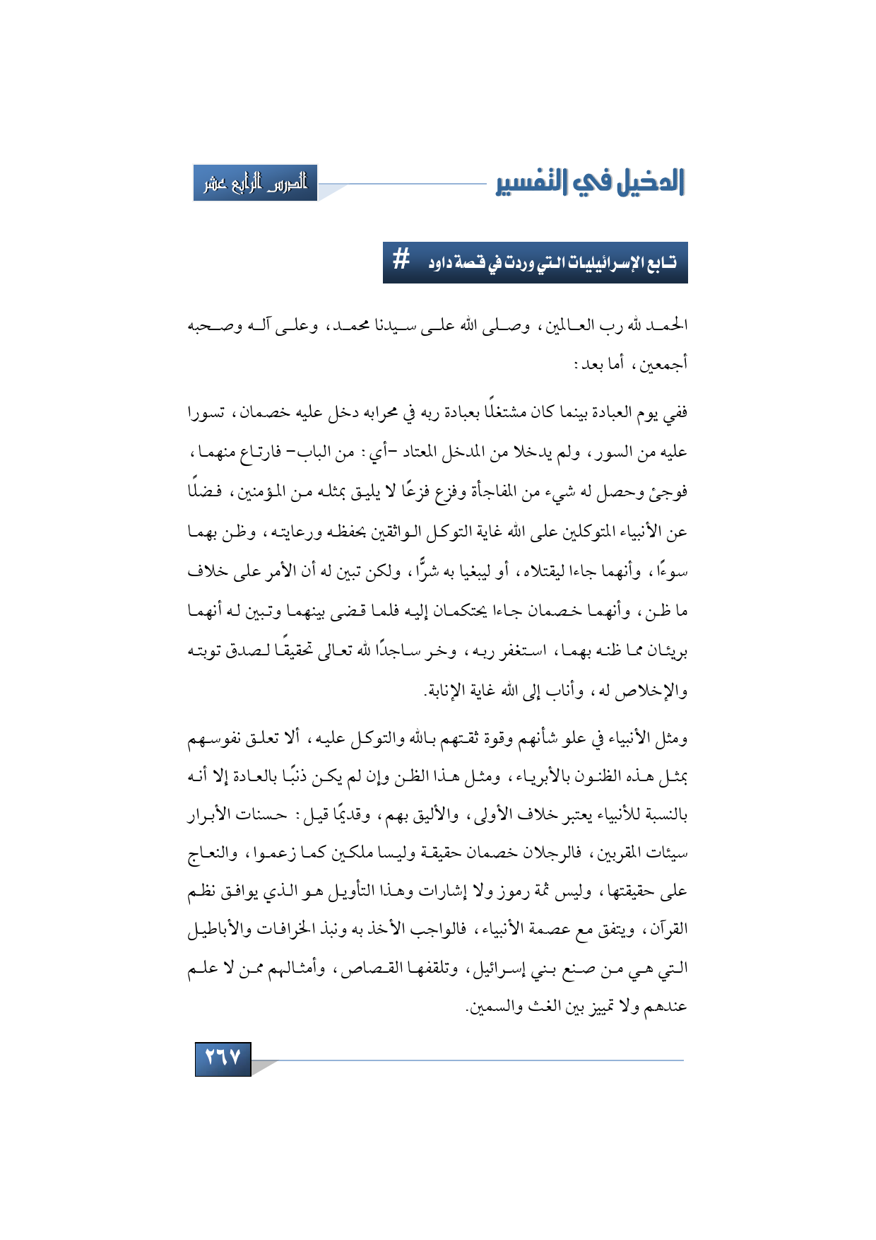 ومثل الأنبياء في علو شأنهم وقوة ثقتهم بالله والتوكل عليه، ألا تعلق نفوسهم بمثل هذه الظنون بالأبرياء، ومثل هذا الظن وإن لم يكن ذنبًا بالعادة إلا أنه بالنسبة للأنبياء يعتبر خلاف الأولى، والأليق بهم، وقديمًا قيل: حسنات الأبرار سيئات المقربين، فالرجلان خصمان حقيقة وليسا ملكين كما زعموا، والنعاج على حقيقتها، وليس ثمة رموز ولا إشارات وهذا التأويل هو الذي يوافق نظم القرآن، ويتفق مع عصمة الأنبياء، فالواجب الأخذ به ونبذ الخرافات والأباطيل التي هي من صنع بني إسرائيل، وتلقفها القصاص، وأمثالهم ممن لا علم عندهم ولا تمييز بين الغث والسمين.