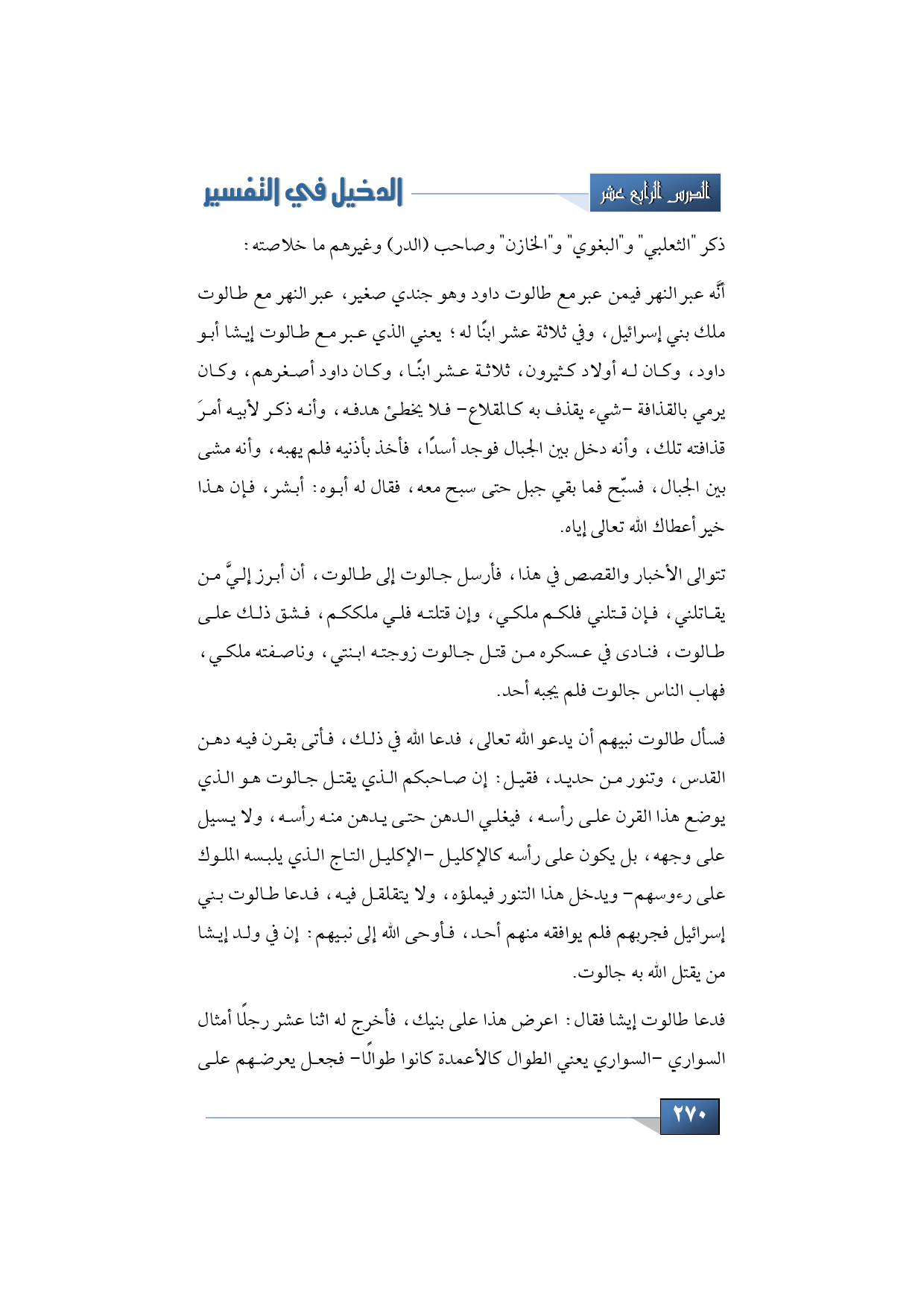 أنَّه عبر النهر فيمن عبر مع طالوت داود وهو جندي صغير، عبر النهر مع طالوت ملك بني إسرائيل، وفي ثلاثة عشر ابنًا له؛ يعني الذي عبر مع طالوت إيشا أبو داود، وكان له أولاد كثيرون، ثلاثة عشر ابنًا، وكان داود أصغرهم، وكان يرمي بالقذافة - شيء يقذف به كالمقلاع - فلا يخطئ هدفه، وأنه ذكر لأبيه أمرَ قذافته تلك، وأنه دخل بين الجبال فوجد أسدًا، فأخذ بأذنيه فلم يهبه، وأنه مشى بين الجبال، فسبّح فما بقي جبل حتى سبح معه، فقال له أبوه: أبشر، فإن هذا خير أعطاك الله تعالى إياه.