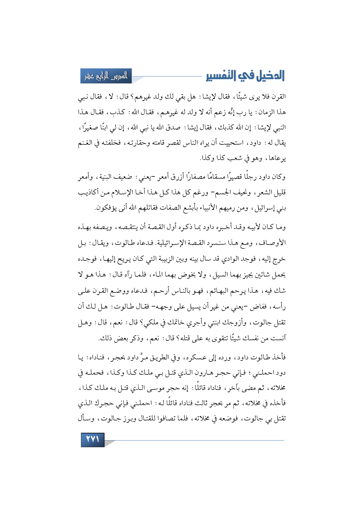 وما كان لأبيه وقد أخبره داود بما ذكره أول القصة أن ينتقصه، ويصفه بهذه الأوصاف، ومع هذا سنسرد القصة الإسرائيلية. فدعاه طالوت، ويقال: بل خرج إليه، فوجد الوادي قد سال بينه وبين الزبيبة التي كان يريح إليها، فوجده يحمل شاتين يجيز بهما السيل، ولا يخوض بهما الماء، فلما رآه قال: هذا هو لا شك فيه، هذا يرحم البهائم، فهو بالناس أرحم، فدعاه ووضع القرن على رأسه، ففاض -يعني من غير أن يسيل على وجهه- فقال طالوت: هل لك أن تقتل جالوت، وأزوجك ابنتي وأجري خاتمك في ملكي؟ قال: نعم، قال: وهل آنست من نفسك شيئًا تتقوى به على قتله؟ قال: نعم، وذكر بعض ذلك.