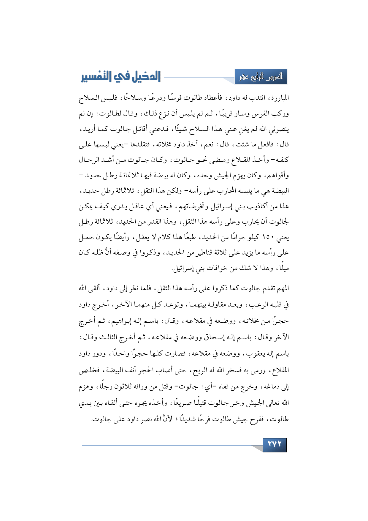 المبارزة، انتدب له داود، فأعطاه طالوت فرسًا ودرعًا وسلاحًا، فلبس السلاح وركب الفرس وسار قريبًا، ثم لم يلبس أن نزع ذلك، وقال لطالوت: إن لم ينصرني الله لم يغنِ عني هذا السلاح شيئًا، فدعني أقاتل جالوت كما أريد، قال: فافعل ما شئت، قال: نعم، أخذ داود مخلاته، فتقلدها - يعني لبسها على كتفه - وأخذ المقلاع ومضى نحو جالوت، وكان جالوت من أشد الرجال وأقواهم، وكان يهزم الجيش وحده، وكان له بيضة فيها ثلاثمائة رطل حديد -البيضة هي ما يلبسه المحارب على رأسه - ولكن هذا الثقل، ثلاثمائة رطل حديد، هذا من أكاذيب بني إسرائيل وتخريفاتهم، فيعني أي عاقل يدري كيف يمكن لجالوت أن يحارب وعلى رأسه هذا الثقل، وهذا القدر من الحديد، ثلاثمائة رطل يعني 150 كيلو جرامًا من الحديد، طبعًا هذا كلام لا يعقل، وأيضًا يكون حمل على رأسه ما يزيد على ثلاثة قناطير من الحديد، وذكروا في وصفه أنَّ ظله كان ميلًا، وهذا لا شك من خرافات بني إسرائيل.