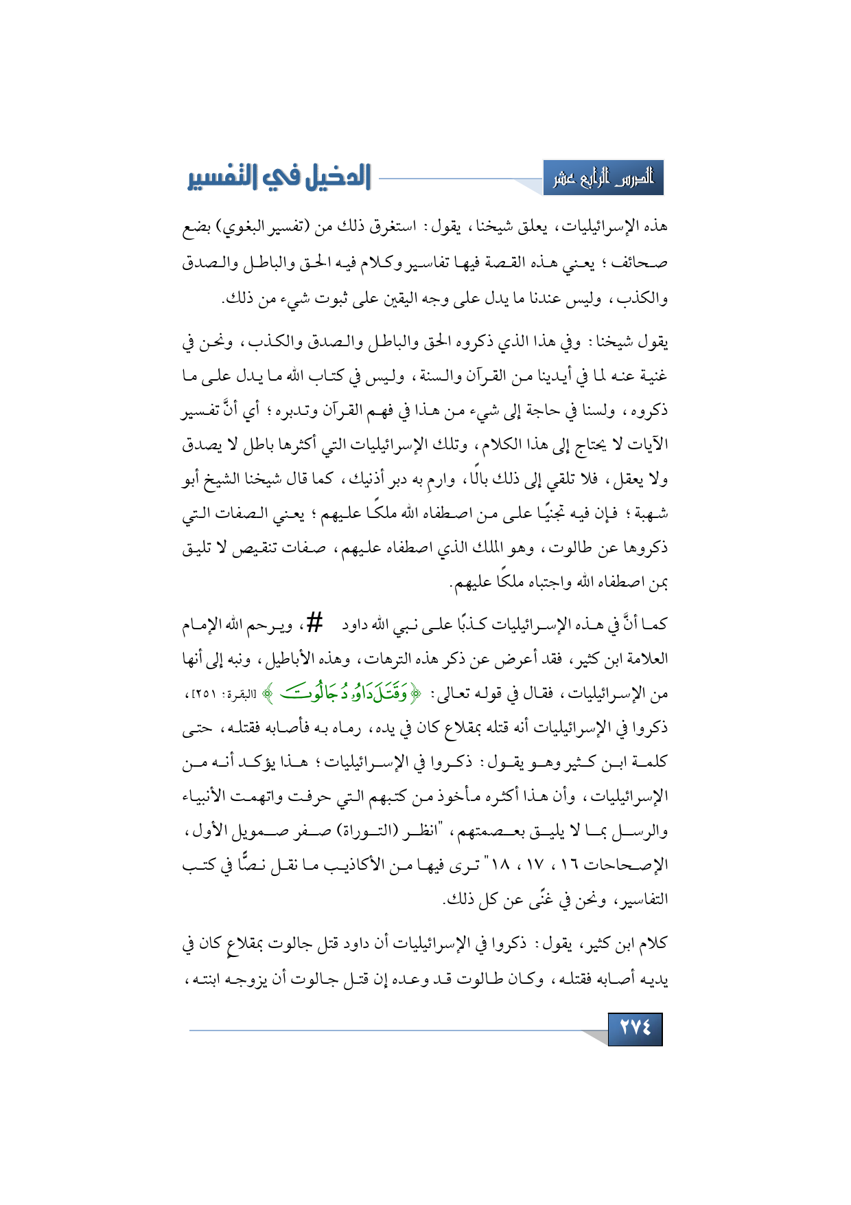 كما أنَّ في هذه الإسرائيليات كذبًا على نبي الله داود - عليه السلام -، ويرحم الله الإمام العلامة ابن كثير، فقد أعرض عن ذكر هذه الترهات، وهذه الأباطيل، ونبه إلى أنها من الإسرائيليات، فقال في قوله تعالى: {وَقَتَلَ دَاوُدُ جَالُوتَ} (البقرة: 251)، ذكروا في الإسرائيليات أنه قتله بمقلاع كان في يده، رماه به فأصابه فقتله، حتى كلمة ابن كثير وهو يقول: ذكروا في الإسرائيليات؛ هذا يؤكد أنه من الإسرائيليات، وأن هذا أكثره مأخوذ من كتبهم التي حرفت واتهمت الأنبياء والرسل بما لا يليق بعصمتهم، " انظر (التوراة) صفر صمويل الأول، الإصحاحات 16، 17، 18 " ترى فيها من الأكاذيب ما نقل نصًّا في كتب التفاسير، ونحن في غنًى عن كل ذلك.