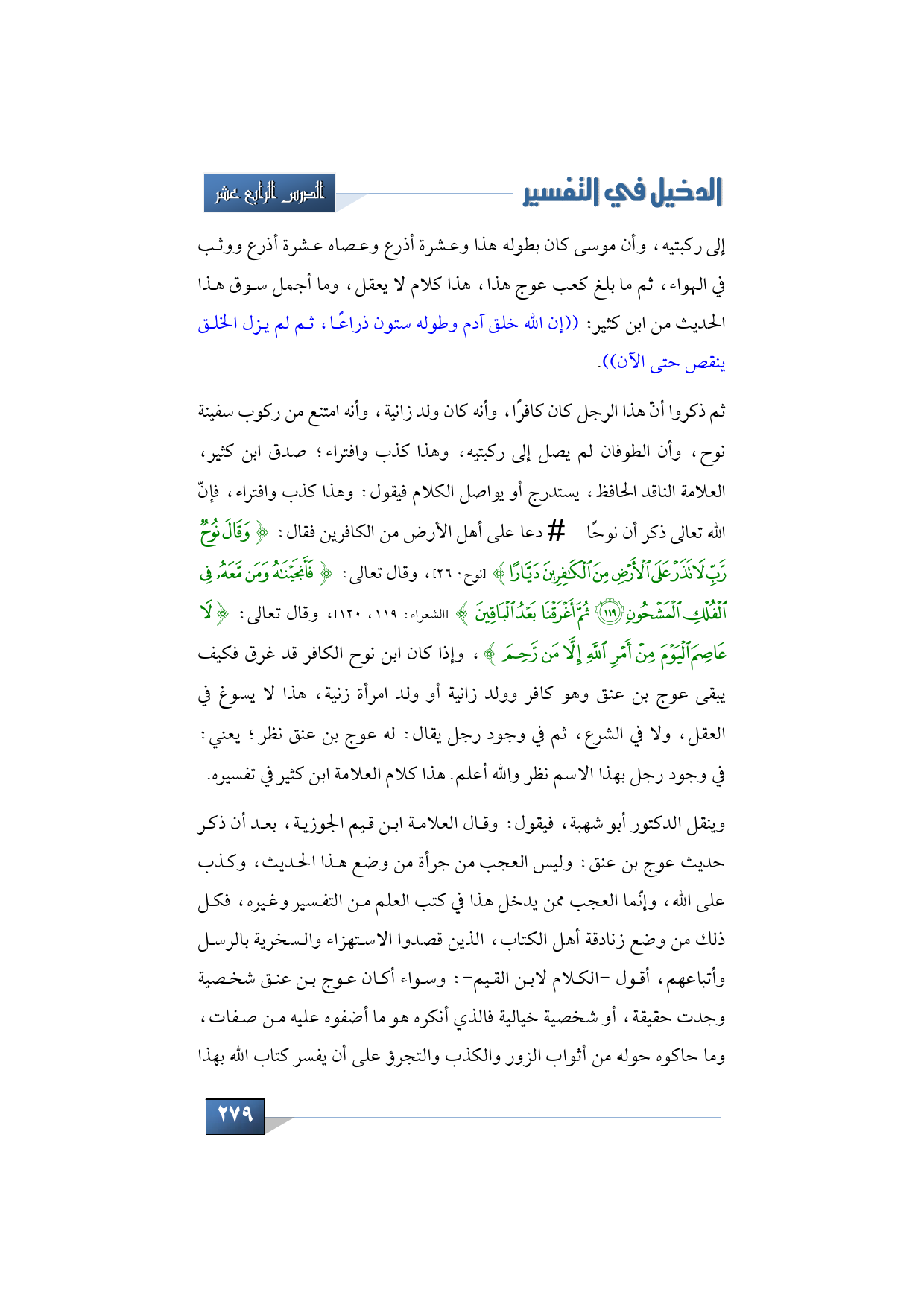 ثم ذكروا أنّ هذا الرجل كان كافرًا، وأنه كان ولد زانية، وأنه امتنع من ركوب سفينة نوح، وأن الطوفان لم يصل إلى ركبتيه، وهذا كذب وافتراء؛ صدق ابن كثير، العلامة الناقد الحافظ، يستدرج أو يواصل الكلام فيقول: وهذا كذب وافتراء، فإنّ الله تعالى ذكر أن نوحًا - عليه السلام - دعا على أهل الأرض من الكافرين فقال: {وَقَالَ نُوحٌ رَّبِّ لاَ تَذَرْ عَلَى الأَرْضِ مِنَ الْكَافِرِينَ دَيَّارًا} (نوح: 26)، وقال تعالى: {فَأَنجَيْنَاهُ وَمَن مَّعَهُ فِي الْفُلْكِ الْمَشْحُون * ثُمَّ أَغْرَقْنَا بَعْدُ الْبَاقِين} (الشعراء: 119، 120)، وقال تعالى: {لاَ عَاصِمَ الْيَوْمَ مِنْ أَمْرِ اللهِ إِلاَّ مَن رَّحِمَ}، وإذا كان ابن نوح الكافر قد غرق فكيف يبقى عوج بن ع ن ق وهو كافر وولد زانية أو ولد امرأة زنية، هذا لا يسوغ في العقل، ولا في الشرع، ثم في وجود رجل يقال: له عوج بن ع ن ق نظر؛ يعني: في وجود رجل بهذا الاسم نظر والله أعلم. هذا كلام العلامة ابن كثير في ت فسيره.