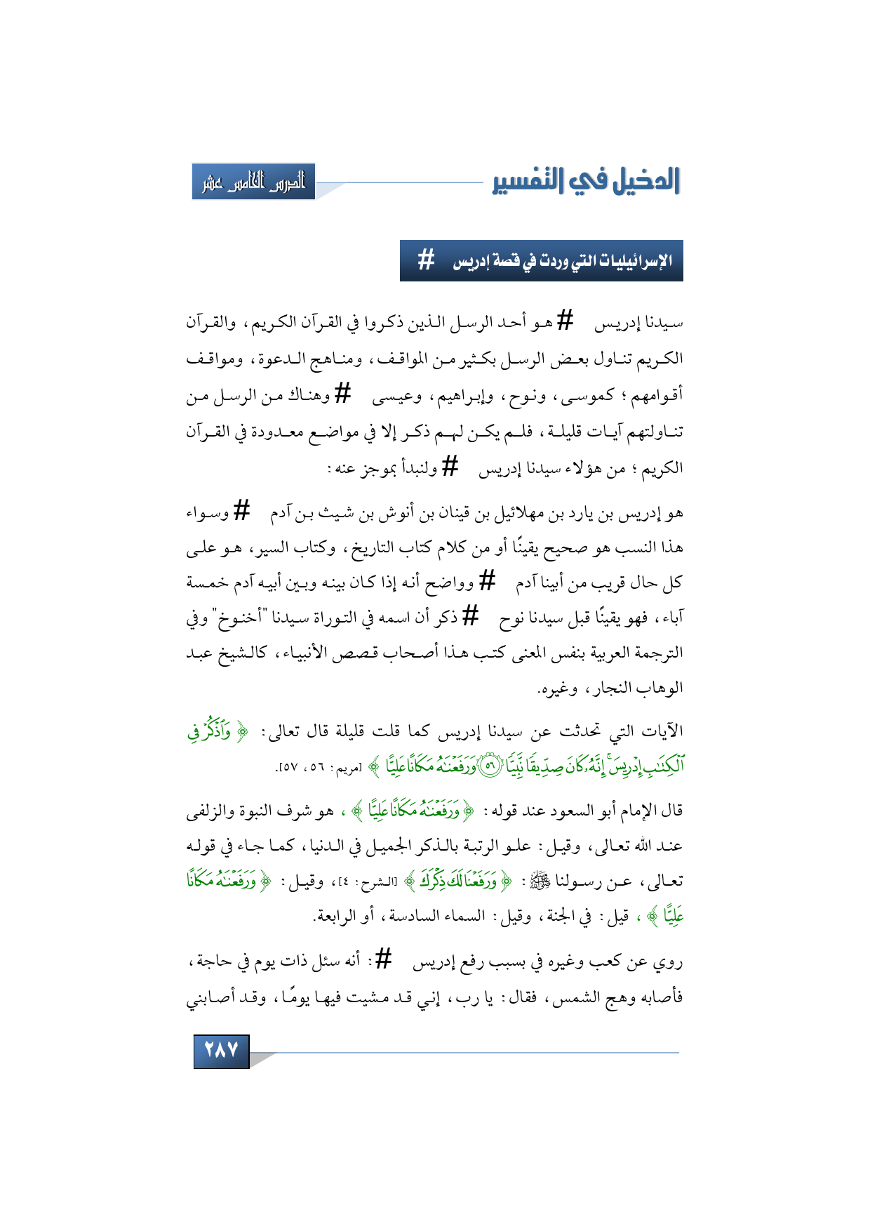 الآيات التي تحدثت عن سيدنا إدريس كما قلت قليلة قال تعالى: {وَاذْكُرْ فِي الْكِتَابِ إِدْرِيسَ إِنَّهُ كَانَ صِدِّيقًا نَّبِيًّا * وَرَفَعْنَاهُ مَكَانًا عَلِيًّا} (مريم: 56، 57).